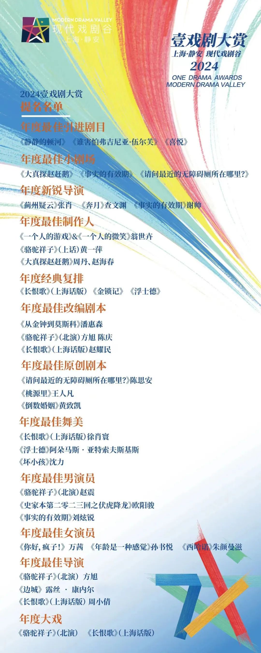 近日,2024上海·静安现代戏剧谷“壹戏剧大赏”提名委员会顺利完成初评工作。经过初评委员会激烈讨论和谨慎评议,20余部剧目从155部作品中脱颖而出,共同角逐2024年度“壹戏剧大赏”的各大奖项。