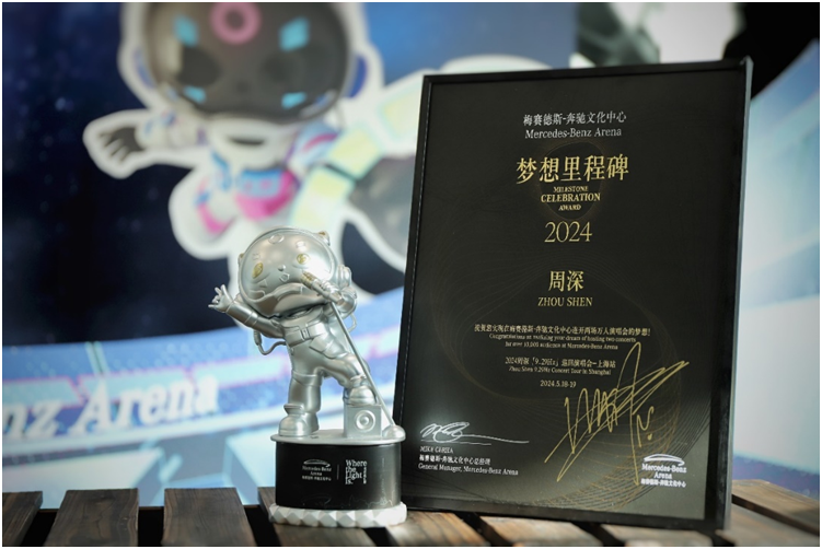 四年前,周深许下心愿——在梅奔中心举办个人演唱会,此番便迎来“圆梦时刻”。为了庆祝这一特别时刻,梅奔中心为他精心策划并定制了专属的“梦想里程碑”奖杯和证书,祝贺他在梅奔中心完成连开两场万人演唱会的梦想。这份荣誉不仅是对其音乐梦想的认可,也充分体现了梅奔中心作为世界级演出场馆的卓越地位。