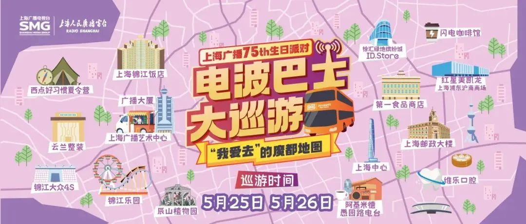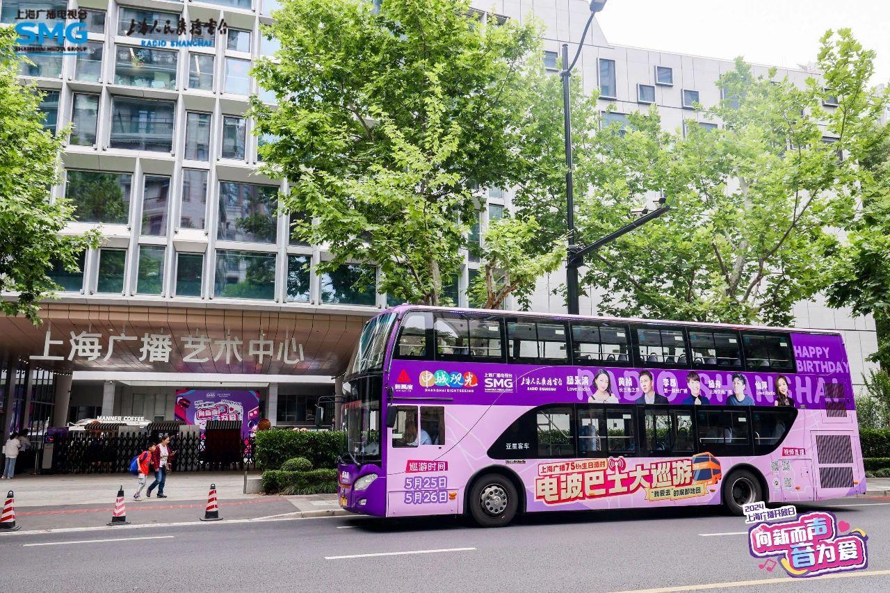 上海广播IP活动之一,“电波巴士大巡游”于5月25日上午正式发车。25日、26日两天,装饰一新的“电波巴士”将穿梭于上海的大街小巷,打卡上海多个魅力地标和各大商圈:上海中心、锦江饭店、锦江乐园、第一食品商店、徐汇绿地缤纷城……