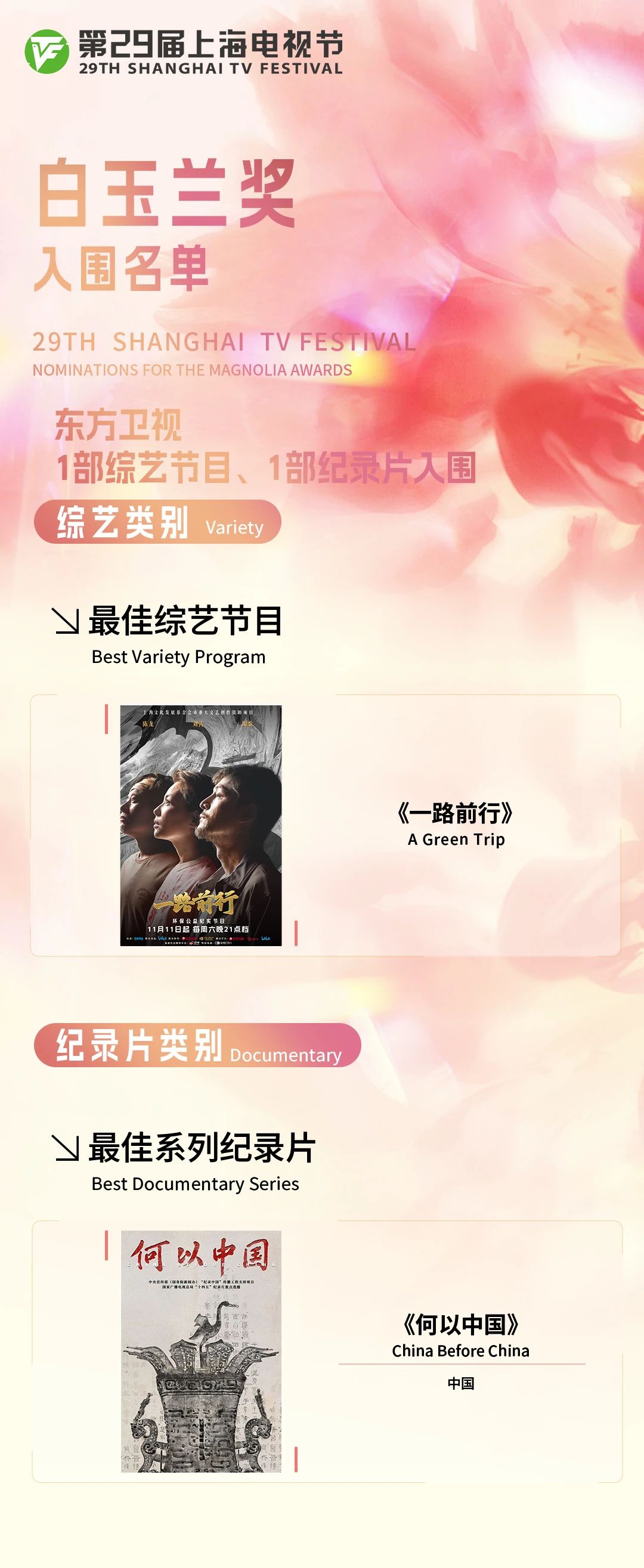 第二十九届上海电视节白玉兰奖入围名单5月30日晚揭晓,由上海广播电视台出品的纪录片《何以中国》、环保公益纪实节目《一路前行》、电视剧《欢迎来到麦乐村》,以及在东方卫视播出的《不完美受害人》《繁花》《漫长的季节》《南来北往》4部品质大剧入围32个奖项名单。