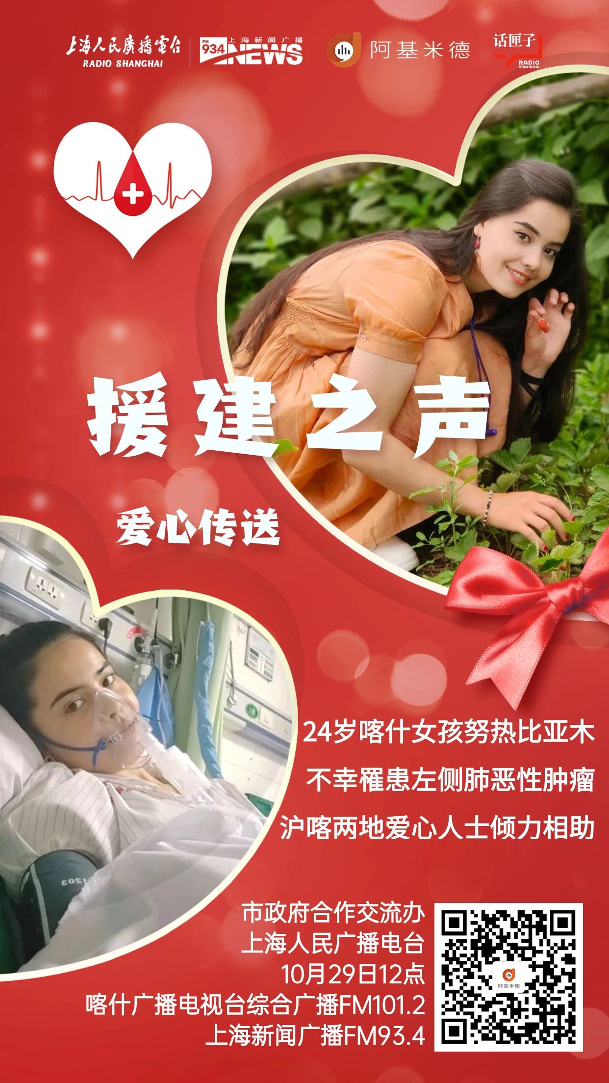 2023年10月29日,《援建之声》制作特别节目,讲述24岁喀什女孩努热比亚木不幸被确诊罹患恶性肿瘤,沪喀两地爱心人士及上海援疆医生专家倾力帮助她与病魔抗争的感人故事。节目播出后,两地众多听众前来询问如何给女孩提供帮助等。