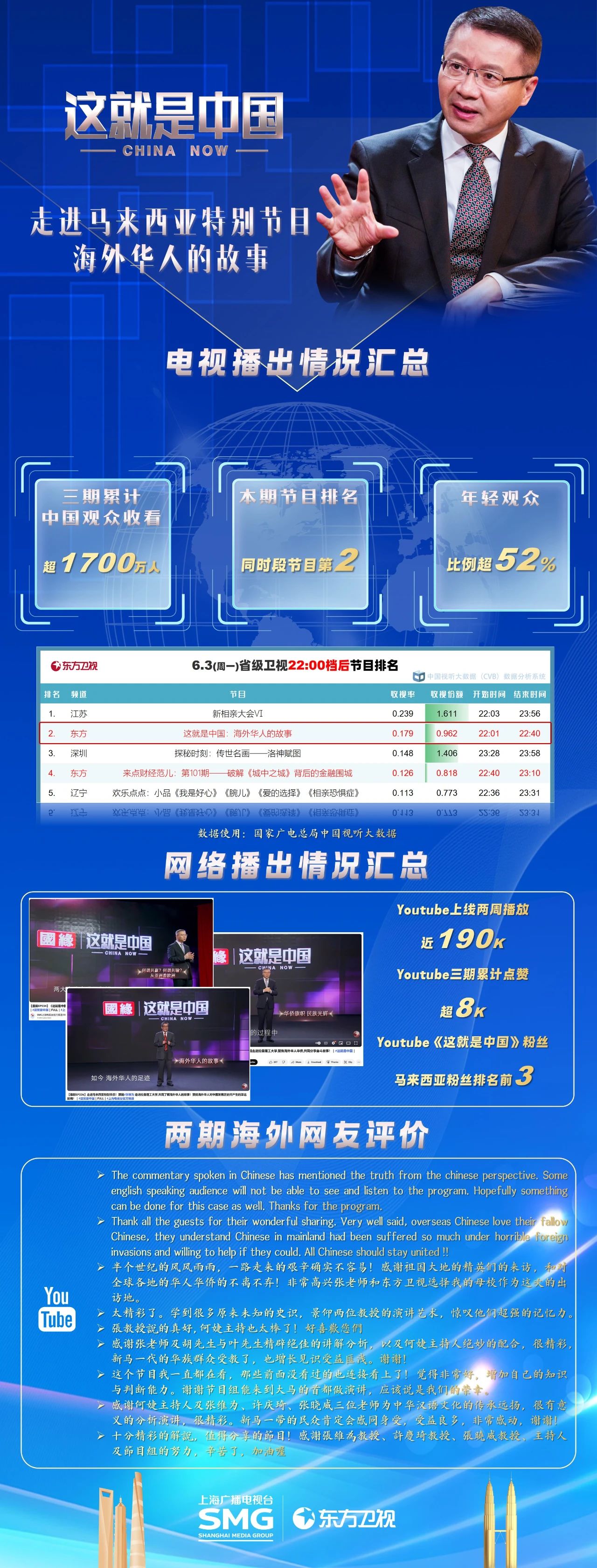 三集节目在B站上的播放量共计达21万,点赞量7千次,评分高达9.1分,深受年轻人的关注与好评。在抖音平台的拆条视频共获得11.4万的点赞量,单条视频“中国的发展让海内外华人振奋”就获得1.8万点赞量。YouTube上的观看次数达16.6万人次。播出后来自马来西亚的粉丝数量增长跃升至前3。除此以外,节目在腾讯、微博、观察者网、观视频、搜狐、咪咕视频等网站上,也收获了较高的关注度与点击率。