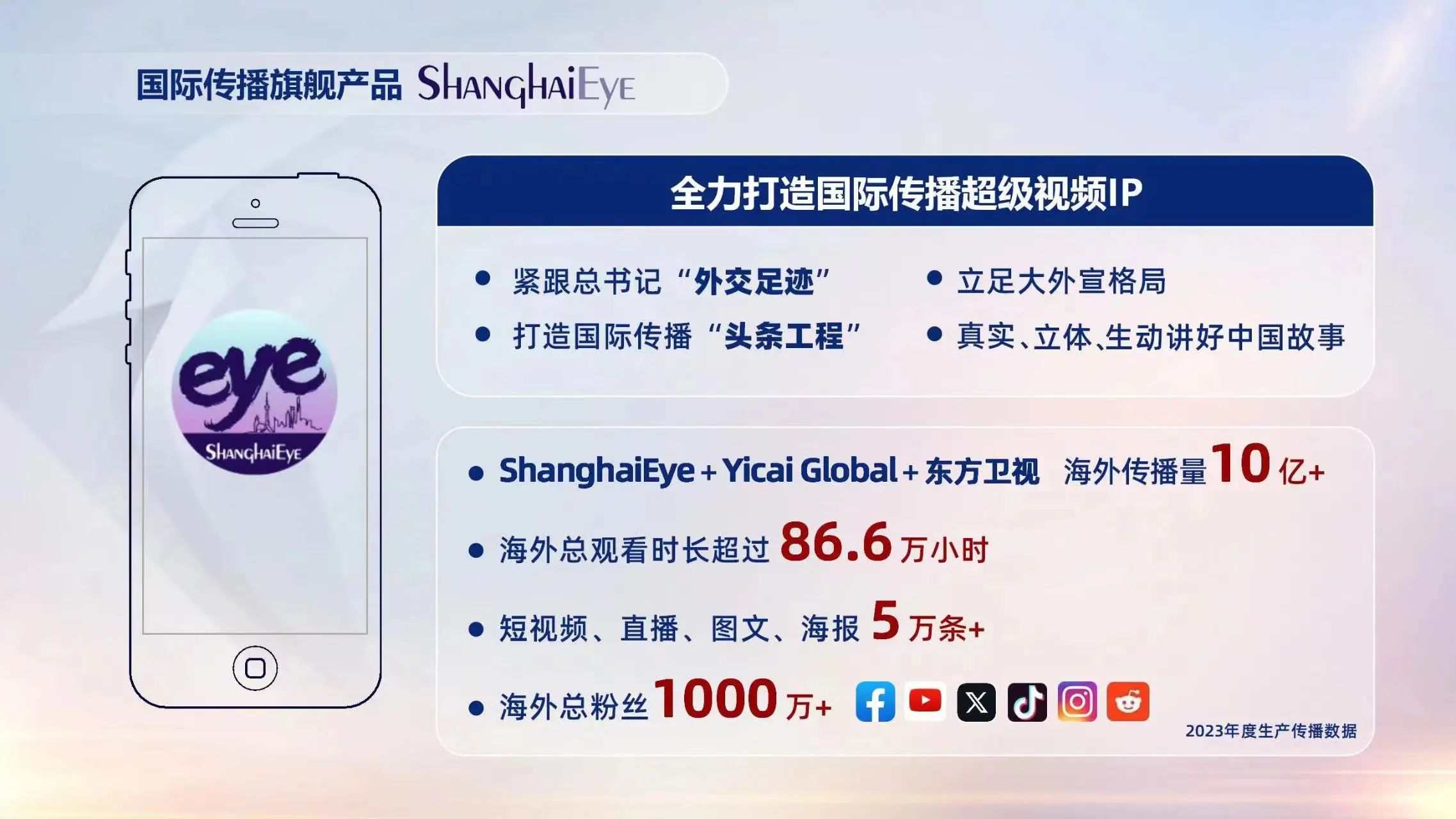 以上海建设习近平文化思想最佳实践地为目标,上海广播电视台于2023年10月成立上海文广国际传播中心,坚持立足上海,做中国式现代化城市文明塑造与国际传播的排头兵,打造旗舰产品ShanghaiEye,建设与上海城市功能相匹配的国际传播立体生态圈。旗舰产品“ShanghaiEye”由超过100名多语种专业人才组成的团队运营,在海外拥有庞大的粉丝基础,海外社媒矩阵总粉丝数已达310万。