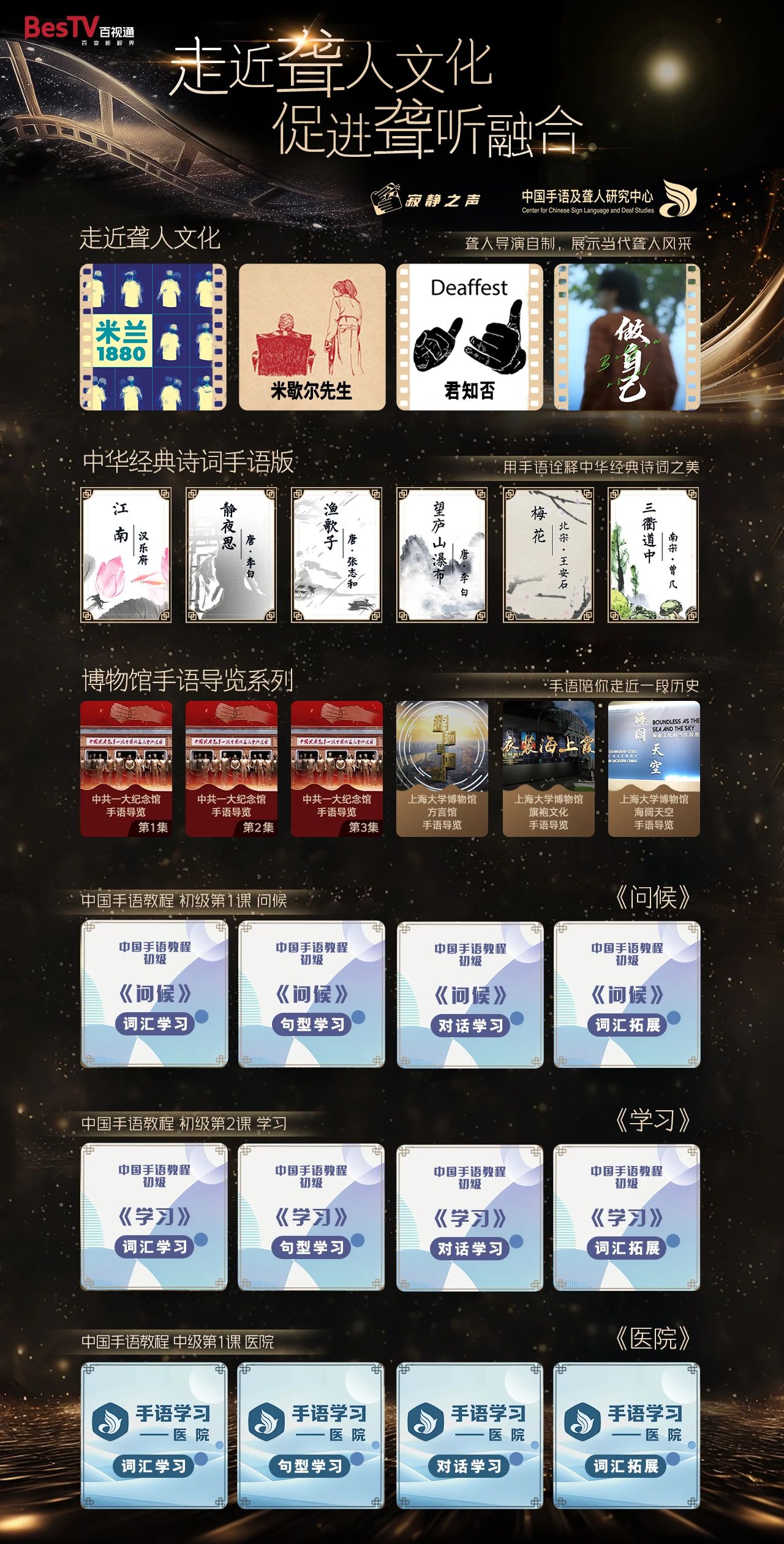百视通作为“SMG无障碍文化艺术创作联盟”一员,在志愿讲解、演出服务、技术支持、内容创作等多方面持续发力,为视听障人群搭建一条线上“视听盲道”,让他们能够享受光影艺术的魅力。近期,百视通还将限时展映多部由上海寂静之声文化传媒有限公司提供的聋人导演影片以及由上海大学中国手语及聋人研究中心制作的《中华经典诗词手语版》、博物馆手语导览系列、《中国手语教程》等内容,与视听障人士一起过节,畅享光影魅力,感受城市温度。