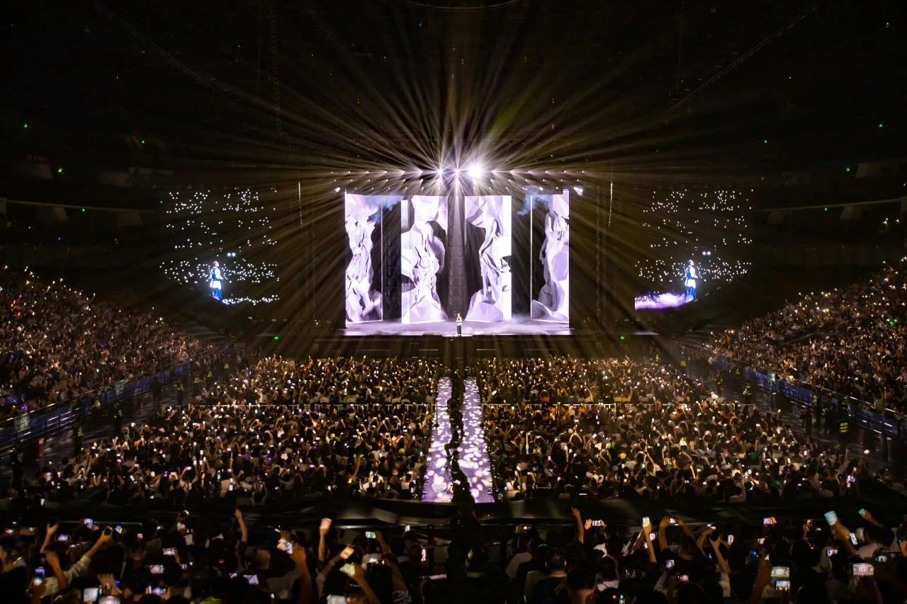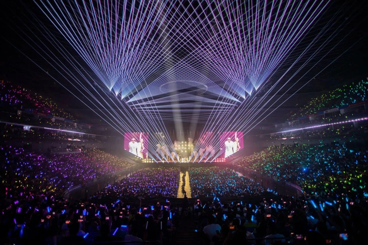 面对舞美搭建的严苛要求和场地空间的复杂挑战,场馆做了多项突破:拆除东面两侧固定看台,延伸舞台东部空间,充分满足舞台搭建和座位区开放需求;舞台设计方面突破极限,采用了800平米P2.5高清LED大屏,四个13*6的大型转台以及裸眼3D技术,营造出前所未有的沉浸式体验;舞台搭建采用了110个吊点,总重量高达78.5吨,创下梅奔中心三面台演唱会的历史新高;音效与视觉效果同样令人震撼,著名镭射团队Mega根据梅奔中心的结构量身打造了令人叹为观止的镭射效果,与场馆室内氛围相得益彰。