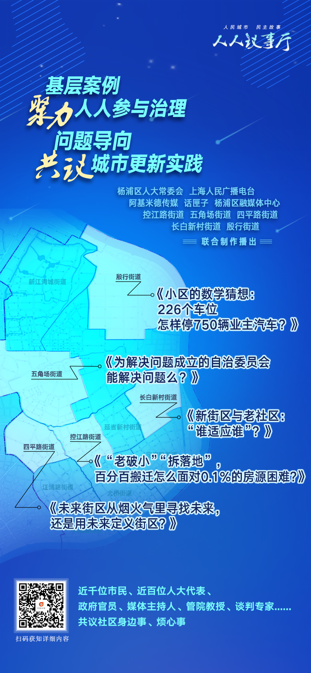 “人民城市 民主故事”人人议事厅特别节目,是上海广播电视台东方广播中心、阿基米德传媒联合杨浦区人大常委会聚焦人民城市建设基层治理创新推出的一档共探社区“无解难题”破解之路的专题节目,通过线下图片直播、活动录制播出,线上跟踪报道的全媒体形式,原汁原味地呈现了在积极推动“全过程人民民主”融入人民城市建设新实践过程中,“人人参与、共商共议”的人人议事现场。