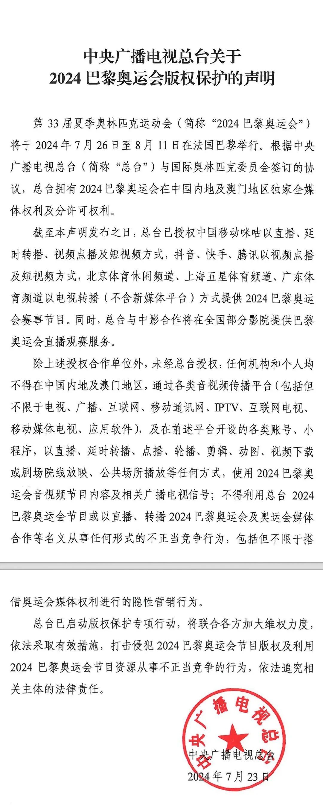 7月23日,中央广播电视总台发布关于2024巴黎奥运会版权保护的声明,央视总台已授权上海广播电视台五星体育频道以电视转播方式提供2024巴黎奥运会赛事节目。