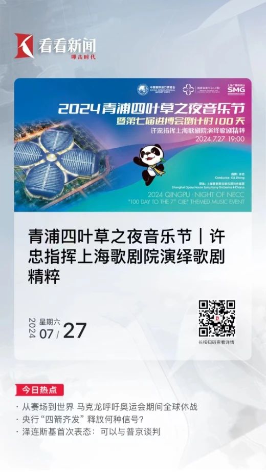 音乐国展,艺术进博。7月27日-28日,在第七届中国国际进口博览会倒计时100天之际,中国国际进口博览局、国家会展中心(上海)与上海广播电视台共同举办的“2024青浦四叶草之夜音乐节”,将在上海标志性建筑之一的国家会展中心(上海)南广场盛大开演。