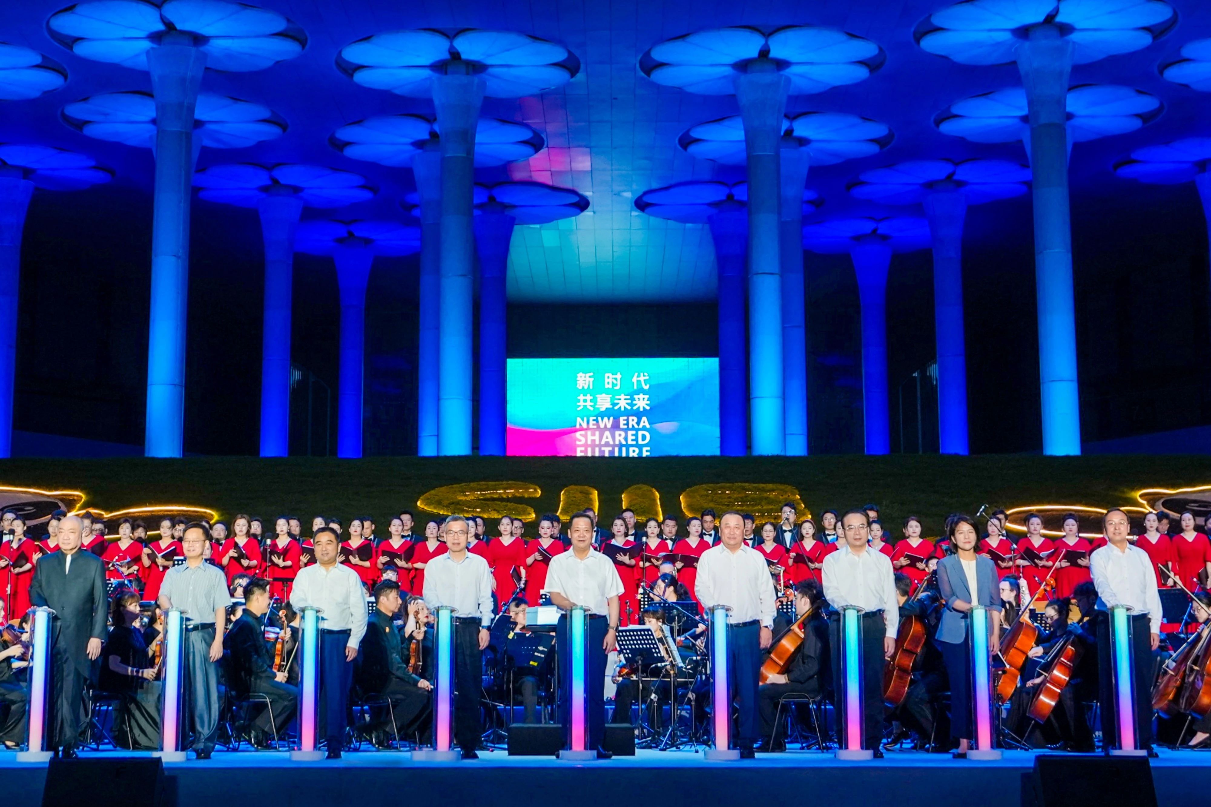 上海市人民政府副秘书长刘平,中国国际进口博览局党委书记、副局长及国家会展中心(上海)有限责任公司董事长孙成海,上海市委宣传部副部长、上海广播电视台台长方世忠,上海市商务委主任朱民,上海虹桥国际中央商务区管委会党组书记、常务副主任钟晓咏,上海市青浦区委副书记、区人民政府区长杨小菁,中国银行上海市分行行长王晓,上海市政府合作交流办公室副主任马文才,上海歌剧院院长许忠等9位领导和嘉宾在现场共同点亮启动装置,标志着“2024青浦四叶草之夜音乐节”暨第七届进博会倒计时100天的正式开启。