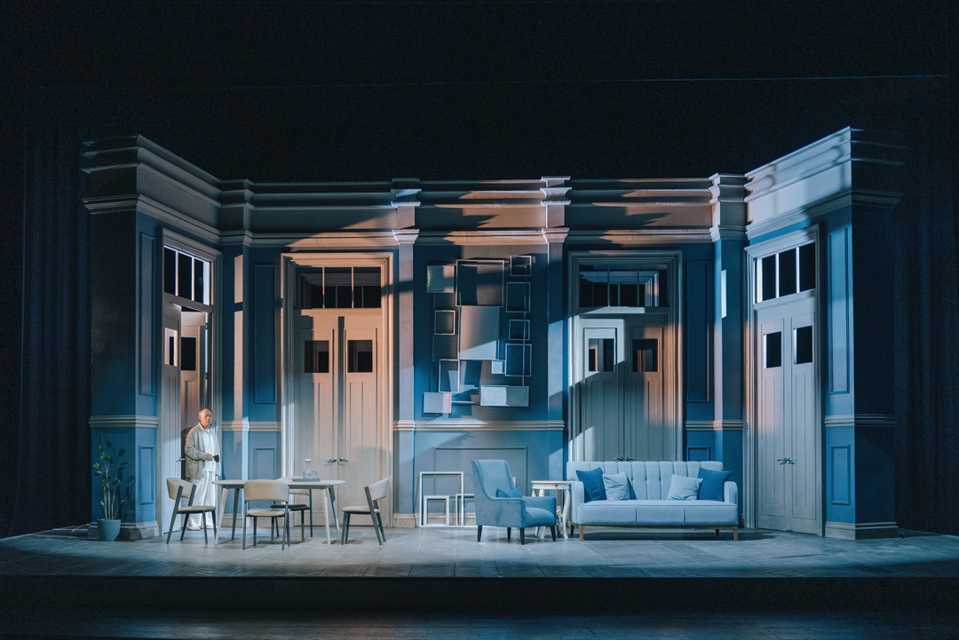 舞台由两面组成,随着剧情的推进,从一间普通客厅到只放着一张床的养老院,每一次舞台旋转道具就会被移动直至完全消失。戏剧临近尾声时,“父亲”在八扇门中不停穿梭,无论打开哪一扇看到的都是那个客厅,他被困在其中,直面生活细节与其记忆一般不受控地消逝,无法逃离……