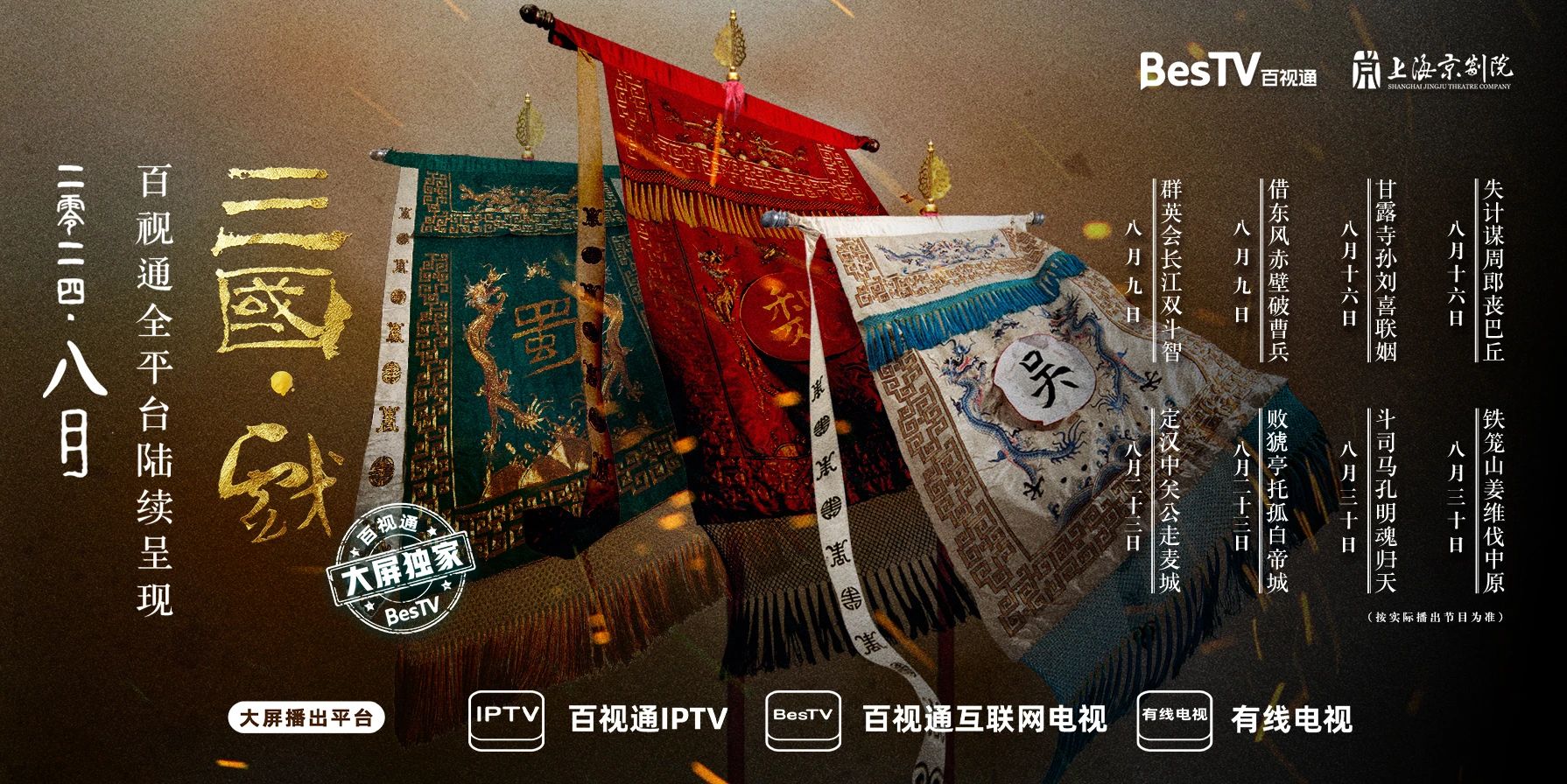 线下“唱罢”,线上“登场”。8月,东方明珠新媒体旗下百视通将在IPTV、互联网电视、有线电视、“BesTV云演艺”客户端、“七彩戏剧”互联网端应用等平台 独家陆续上线“三国·戏”全系列8场演出,邀请全国戏迷朋友一同在云上“梦回三国”。