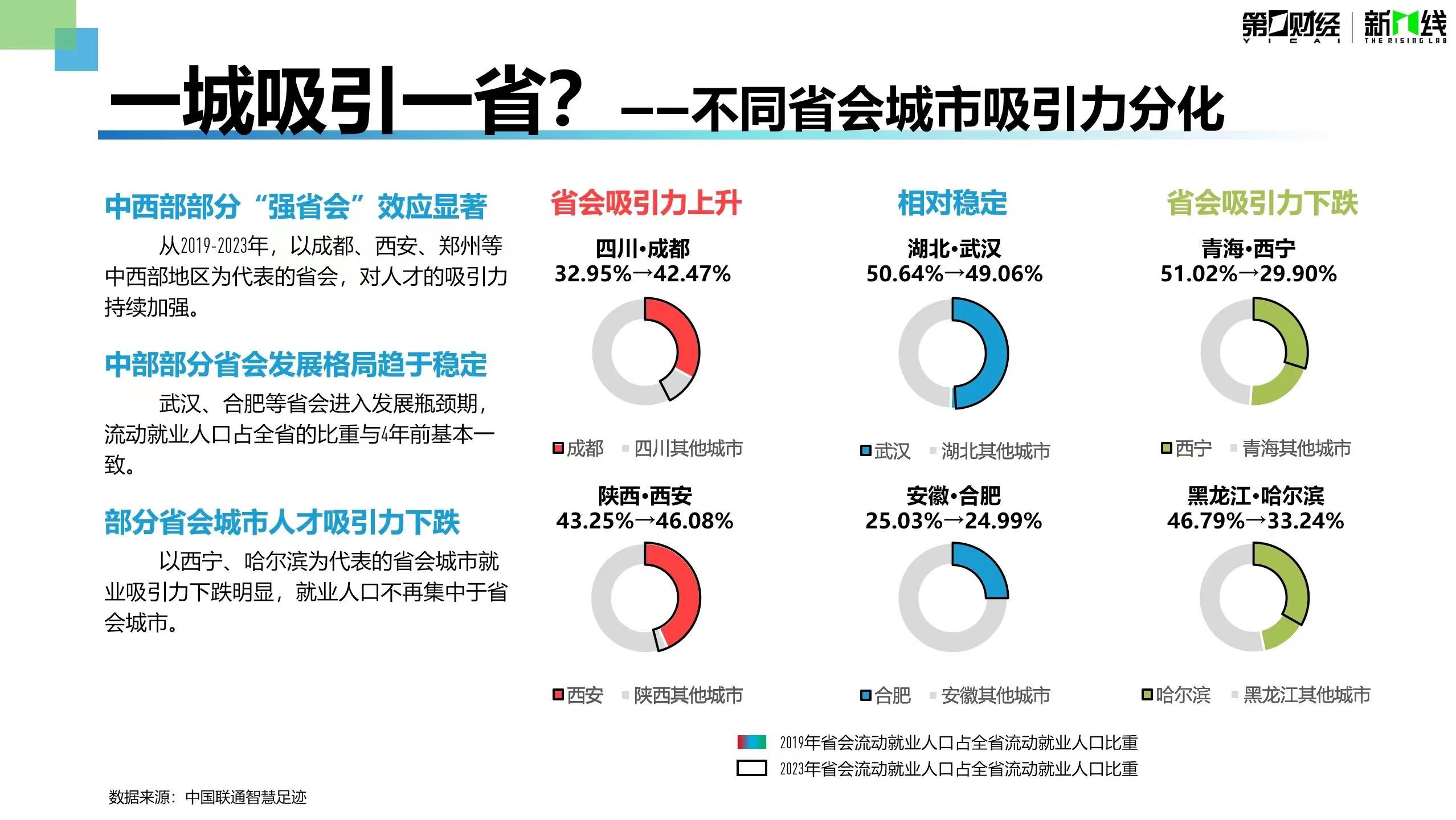 省会对本省人才吸引力出现了明显的分化:以成都、西安、郑州等中西部地区为代表的省会城市,对人才的吸引力持续加强;武汉、合肥等部分中部地区省会吸引力相对稳定;以西宁、哈尔滨为代表的省会相对来说产业竞争力较弱、缺乏持续发展的动力,就业吸引力下跌明显。