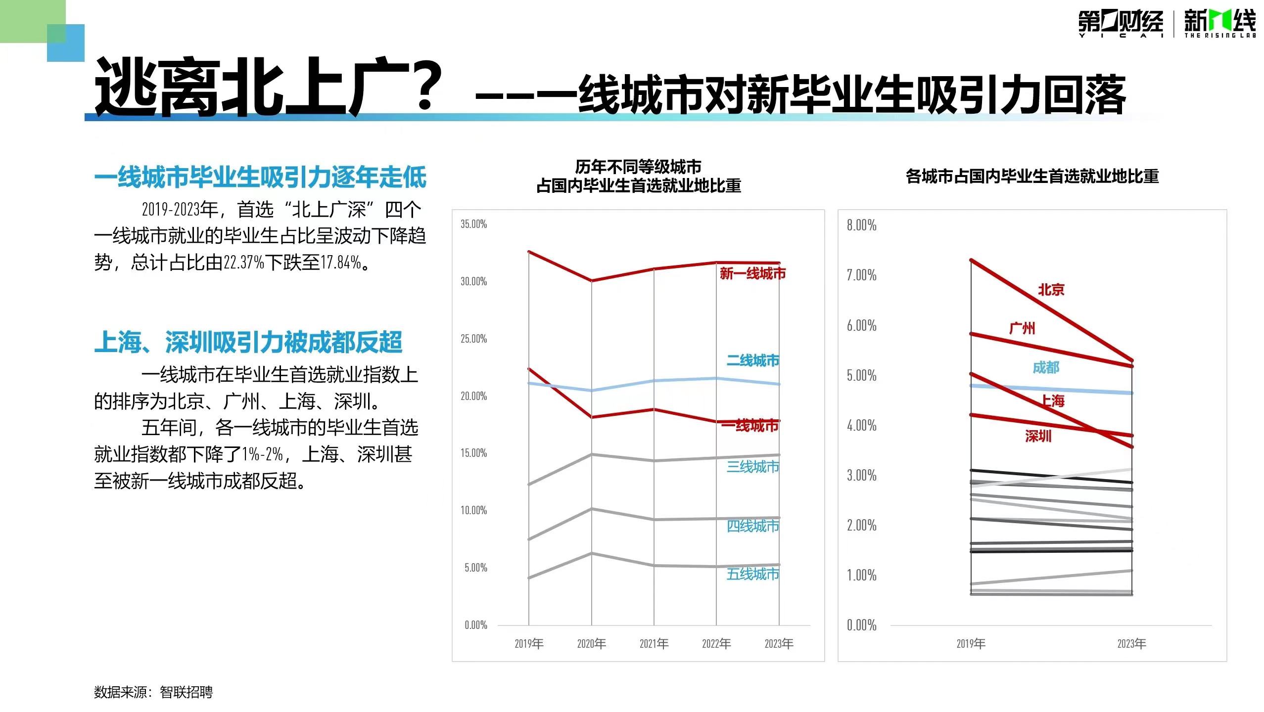 从全国视角来看,一线城市的绝对优势已开始走低。根据智联招聘的毕业生流向数据,北上广深吸收全国毕业生的比例近5年内下跌了4.53%。2023年,广州受益于全国规模第一的大学生规模、较低的生活成本,成为仅次于北京的毕业生首选就业地。上海、深圳的毕业生首选就业指数已被新一线城市成都反超。