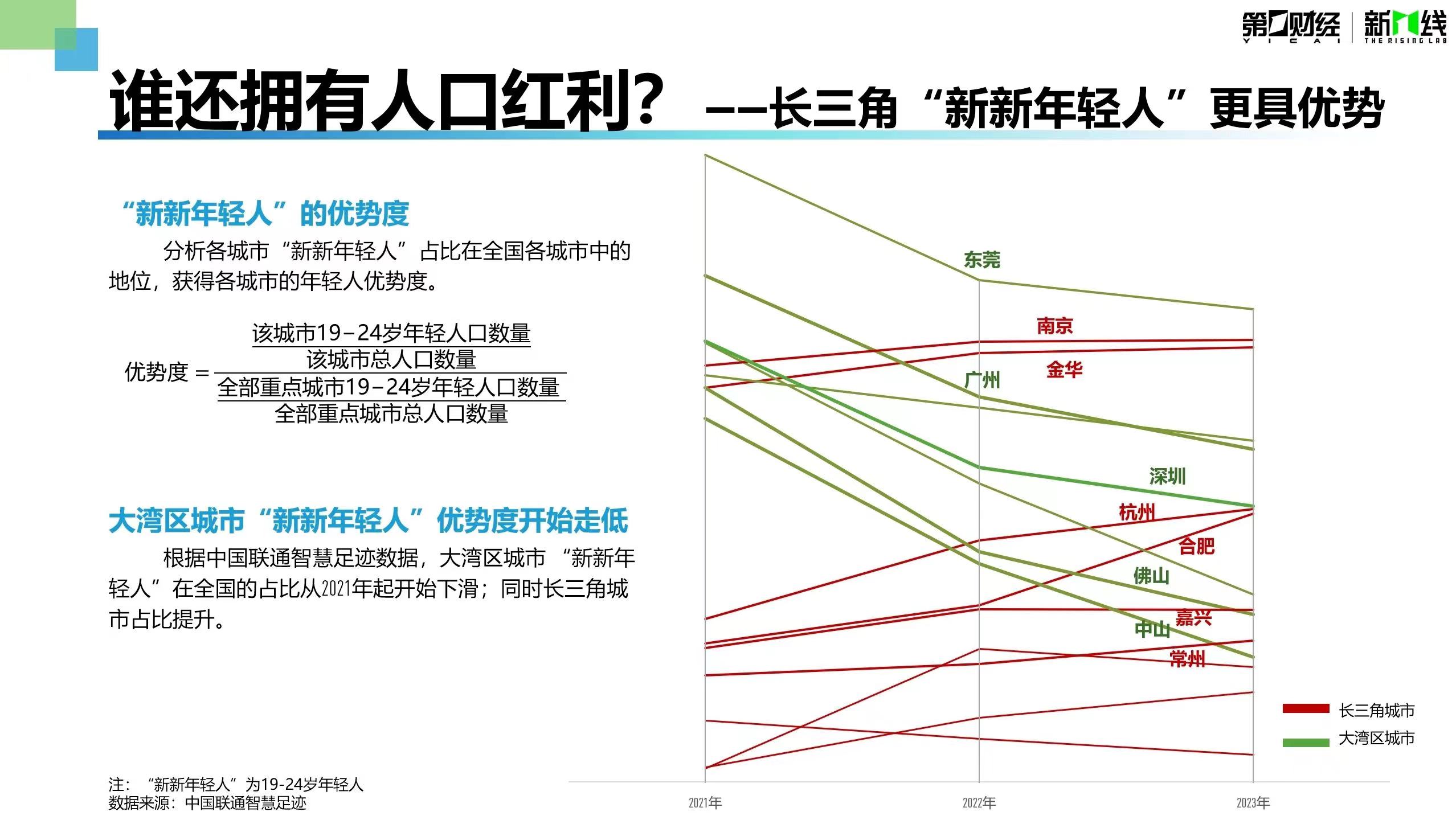 以粤港澳大湾区和长三角为例,报告运用区位熵算法分析了各城市的年轻人优势度。尽管大湾区具有年轻人的存量优势,但最新数据表明其对19至24岁“新新年轻人”的吸引力正在减弱。相比之下,部分长三角新一线和二线城市的年轻人优势度正在上升,例如南京和金华超过了广州;杭州和合肥逐渐追赶上深圳;嘉兴和常州则超越了大湾区的佛山和中山。