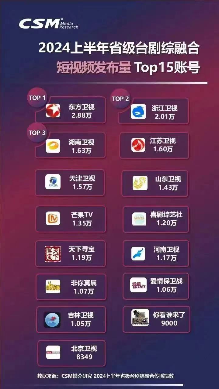 东方卫视坚持头部大综艺和“小而美”综艺并重,打造体现大都市气质和中国式审美的剧综内容,保持在省级台剧综融合传播指数第三位,其中东方卫视剧综融合短视频发布量位列第一。