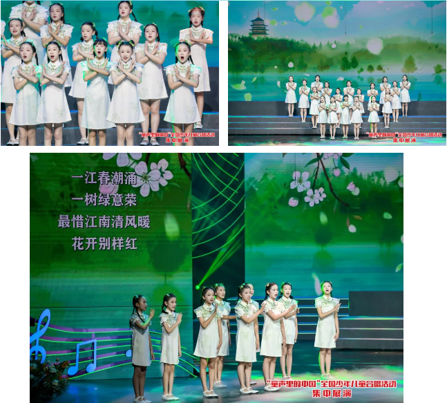 “一曲歌声同,一城烟雨重,最是江南心所安,思绪故人懂。”白墙黛瓦的舞美小景,小桥流水的诗画意境,小荧星合唱团的孩子们身着白衣,款款而来,如白瓷瓶般亭亭立于舞台中央,古筝、琵琶、竹笛伴奏左右,一首《江南记忆》令人陶醉。