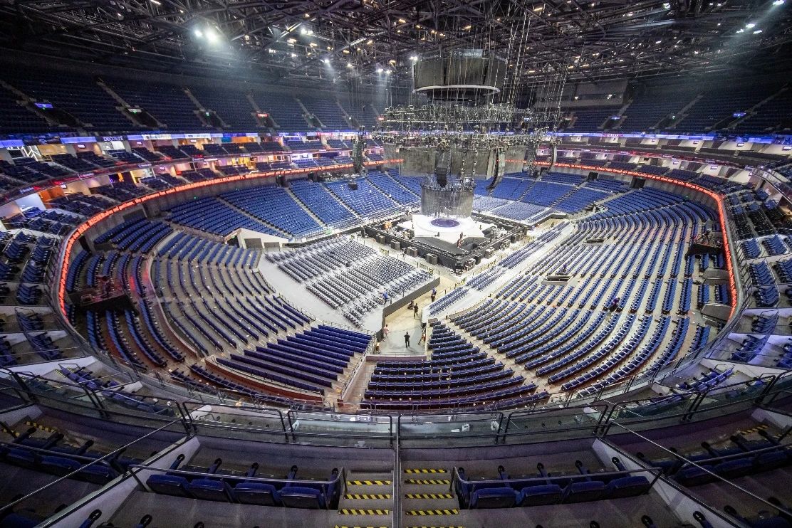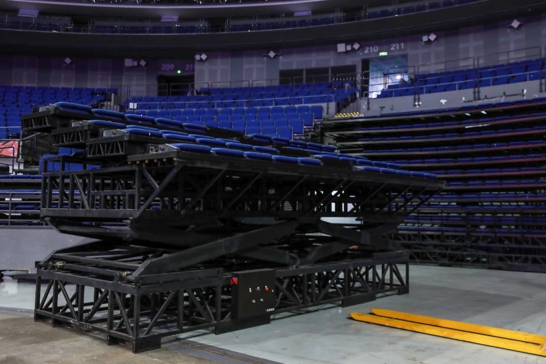 为提升舞台转换的灵活性及创新性,梅奔中心团队在前期工程技术方面做了充分准备。场馆充分利用原有设施设备的功能性,拆除东面两侧固定看台,延伸舞台东部空间,同时利用伸缩看台的“一键可升降”功能,使伸缩座椅的搭建时间从原本18小时缩短至12小时,同时有效增强了伸缩看台的稳定性以及搭建和拆除的安全性。