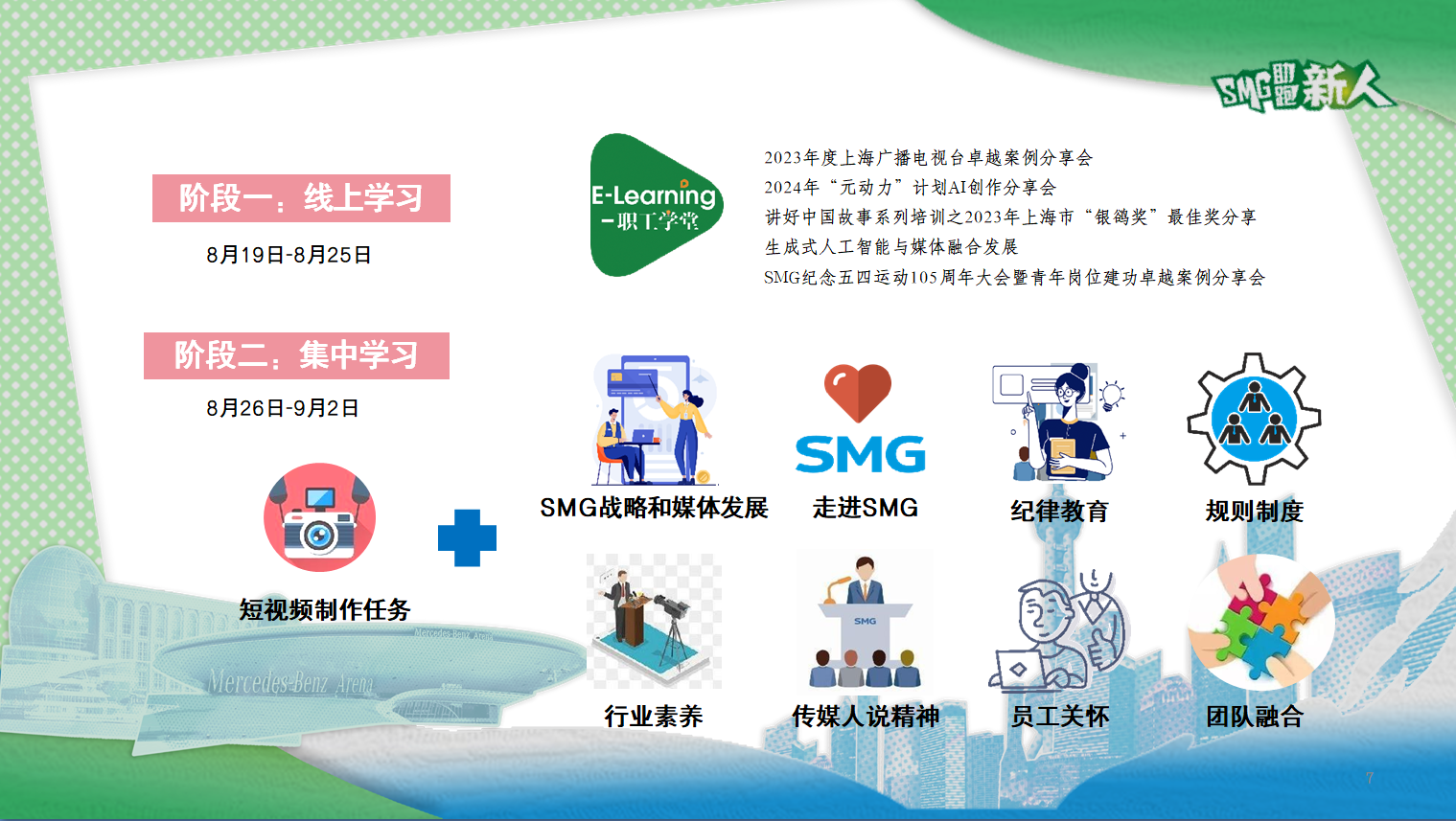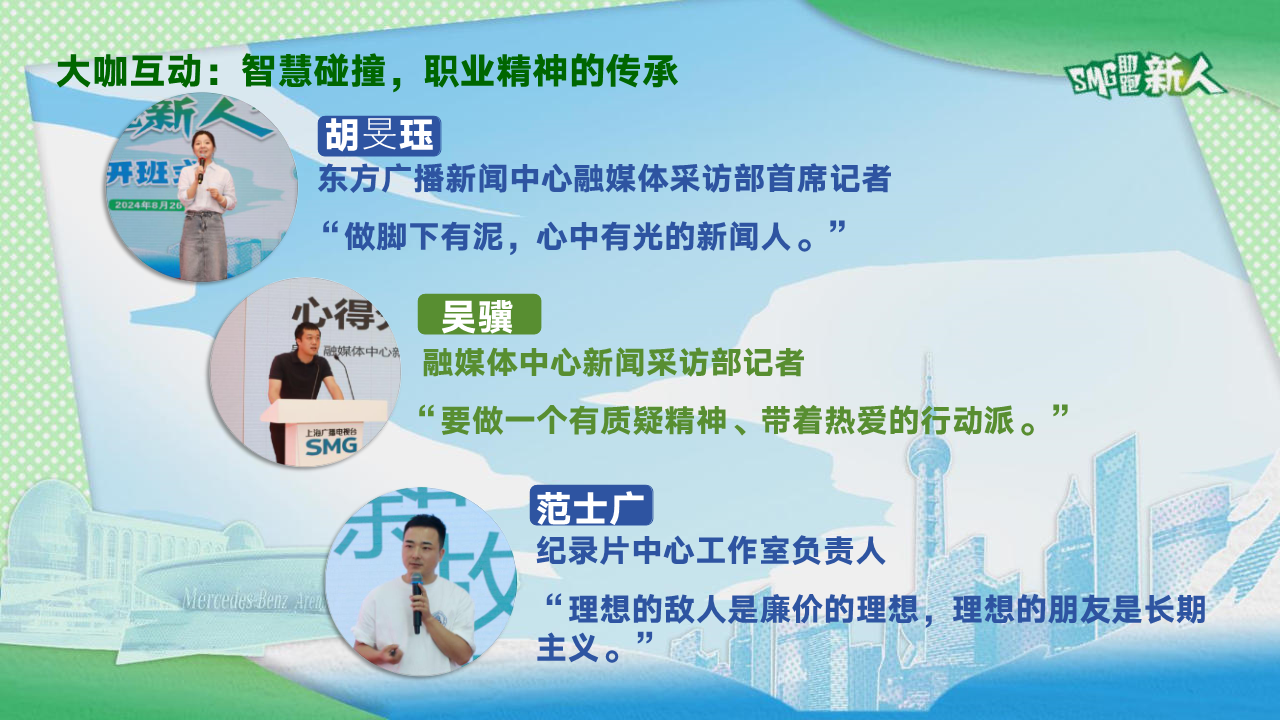 8月26日至9月2日,为期一周的线下集中培训围绕“SMG战略和媒体发展、走进SMG、纪律教育、规则制度、行业素养、传媒人说精神、员工关怀、团队融合”设置了八个模块的培训内容。学员们通过团队融合彼此熟悉,迅速了解了台(集团)的发展战略及核心价值观,从传媒前辈们分享的工作经验中汲取养分,提升责任感、使命感,培养职业道德,强化规范意识。此外,新员工们还就“青爱SMG”和“我参与的助跑新人”两大主题进行了短视频拍摄制作。集中培训前,学员们已经通过线上学习的方式,对台(集团)基本情况形成初步了解并为后续学习打下坚实基础。