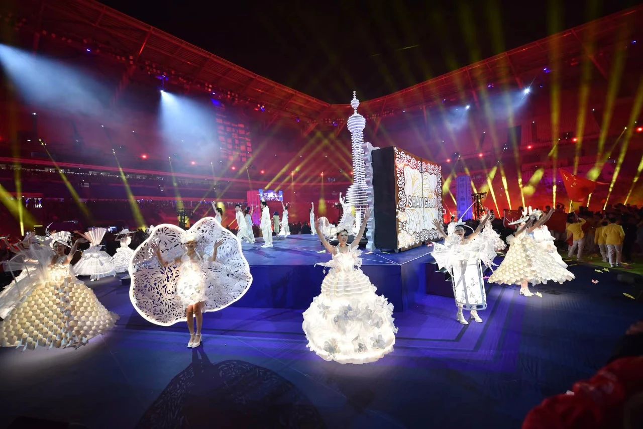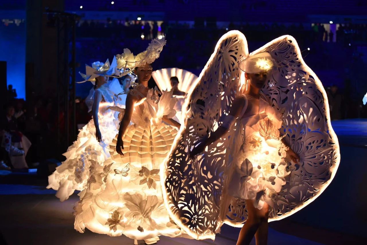 短短11分钟,筹备和制作周期长达7个月。为了找到最适合表达上海魅力、技能传承的元素,团队经过反复讨论、走访,最终才定下以“纸”的变幻为核心。最终,在舞台上大放异彩的环保材料服饰大秀用到了29套高定服饰,其中20套融合了折纸、榫卯、扇形拉伸、走马灯等多种非遗技能,其他则用到了3D打印、充气LED软屏等新科技工艺。此外,舞美设计、服装制作的过程也经历了数以百计的测试和实验,以保证“零失误”的舞台呈现。