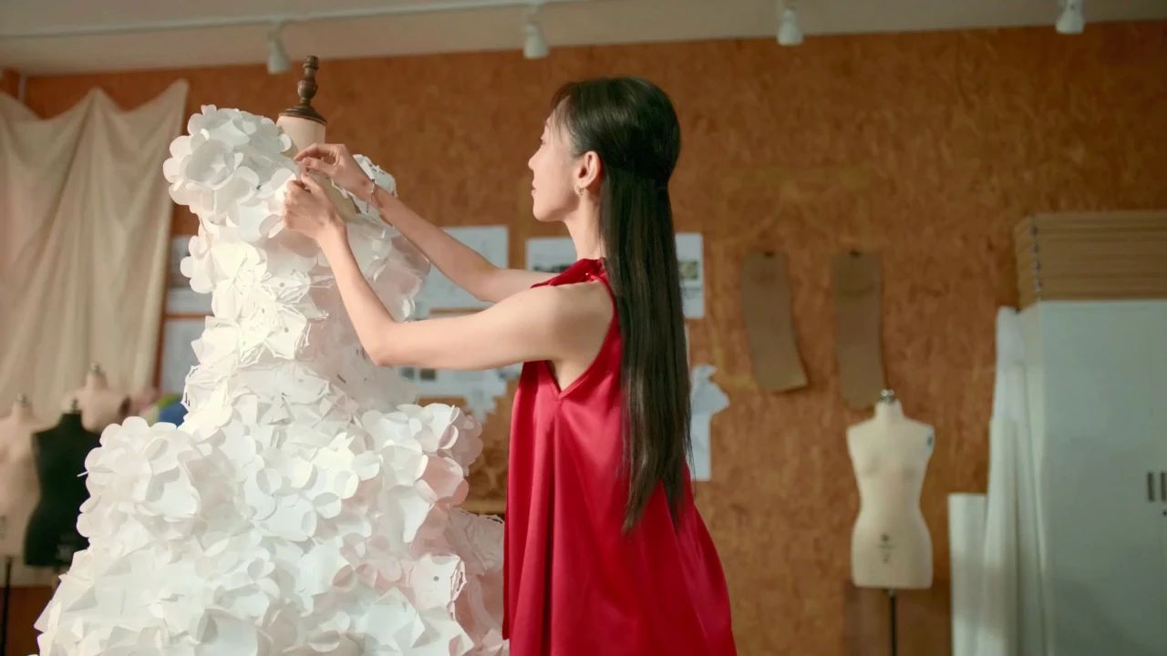 舞蹈演员朱洁静扮演的女设计师以巧手设计裁剪,还原了一件纸质高定服装如何华丽诞生,而一封勾勒中国传统技能、穿越时空而来的“邀请函”出现在画面中:从诞生于东汉的造纸术到不用针线胶水完美拼接的榫卯结构,代代传承的技艺,让“纸”历经千年、不断变化样貌。
