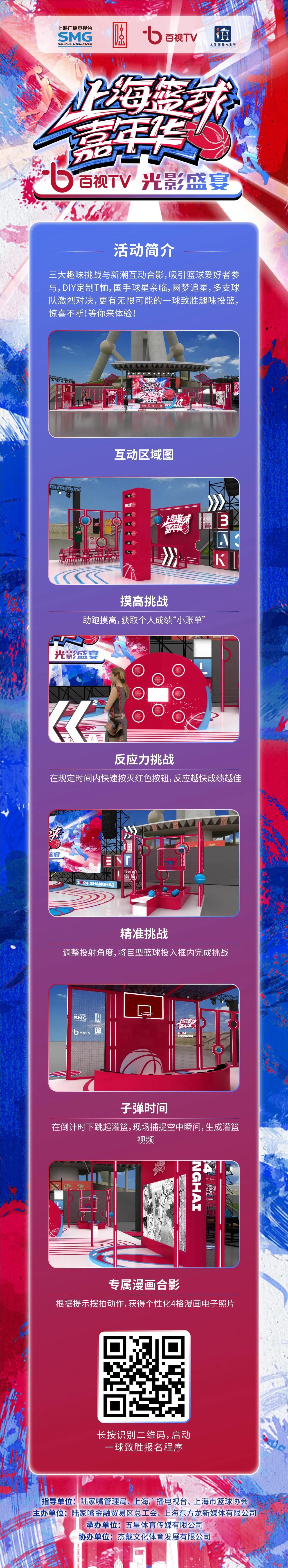“上海篮球嘉年华·百视TV光影盛宴”现场,将有摸高挑战、反应力挑战、精准挑战三大趣味挑战,以及子弹时间和专属漫画合影两项新潮互动。