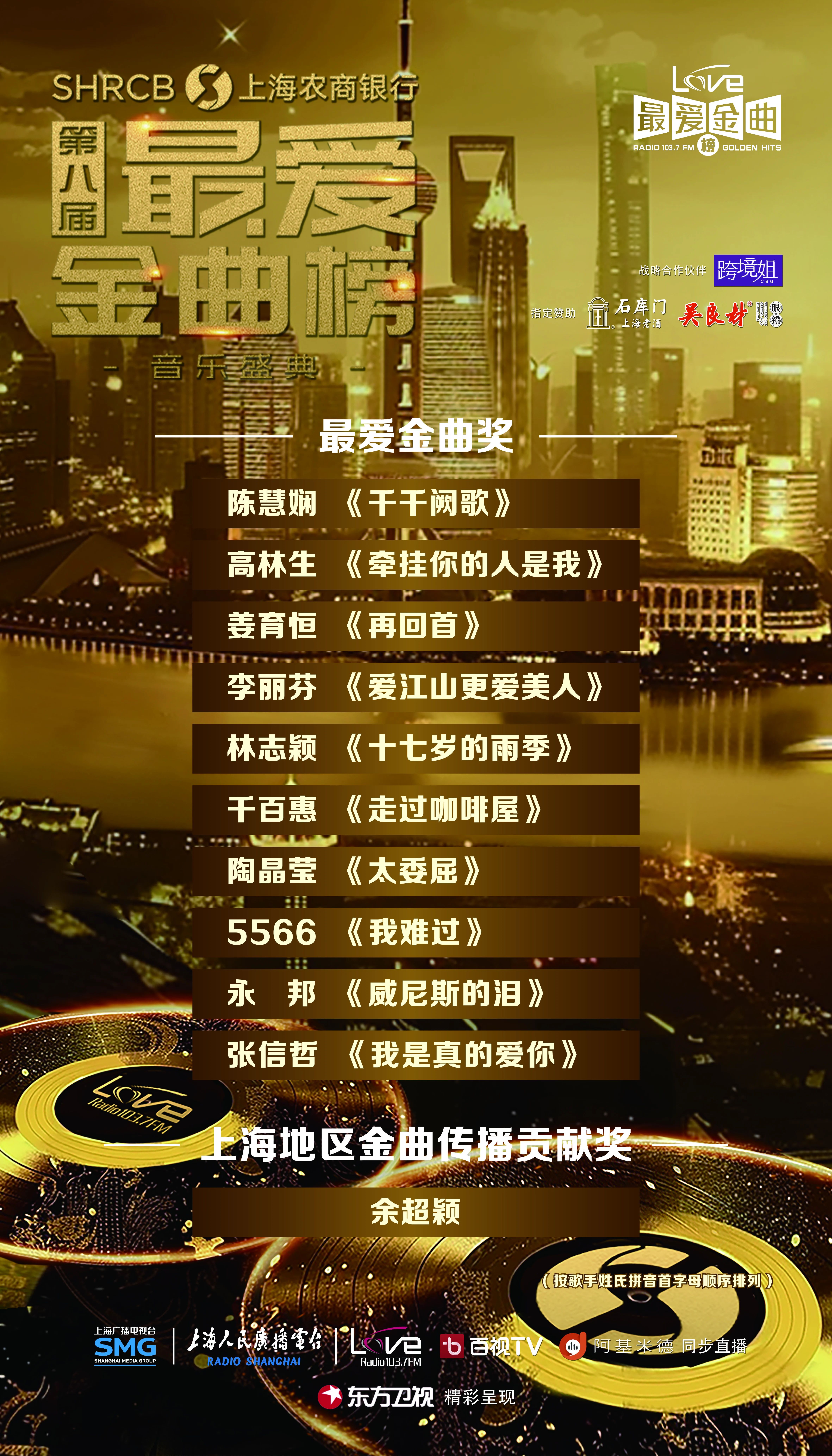 本次盛典以“爱的金曲,共赴青春之旅”为主题,通过Love Radio 103.7《中文金曲馆》《娱乐正当时》《天天点播》《最爱麦克疯》《去有歌的地方》《早安新发现》《最爱金曲榜》七大热播节目串联起整晚的演出,本年度的十大“最爱金曲”荣誉也在盛典现场揭晓(见下图)。同时,余超颖获得了上海地区金曲传播贡献奖。