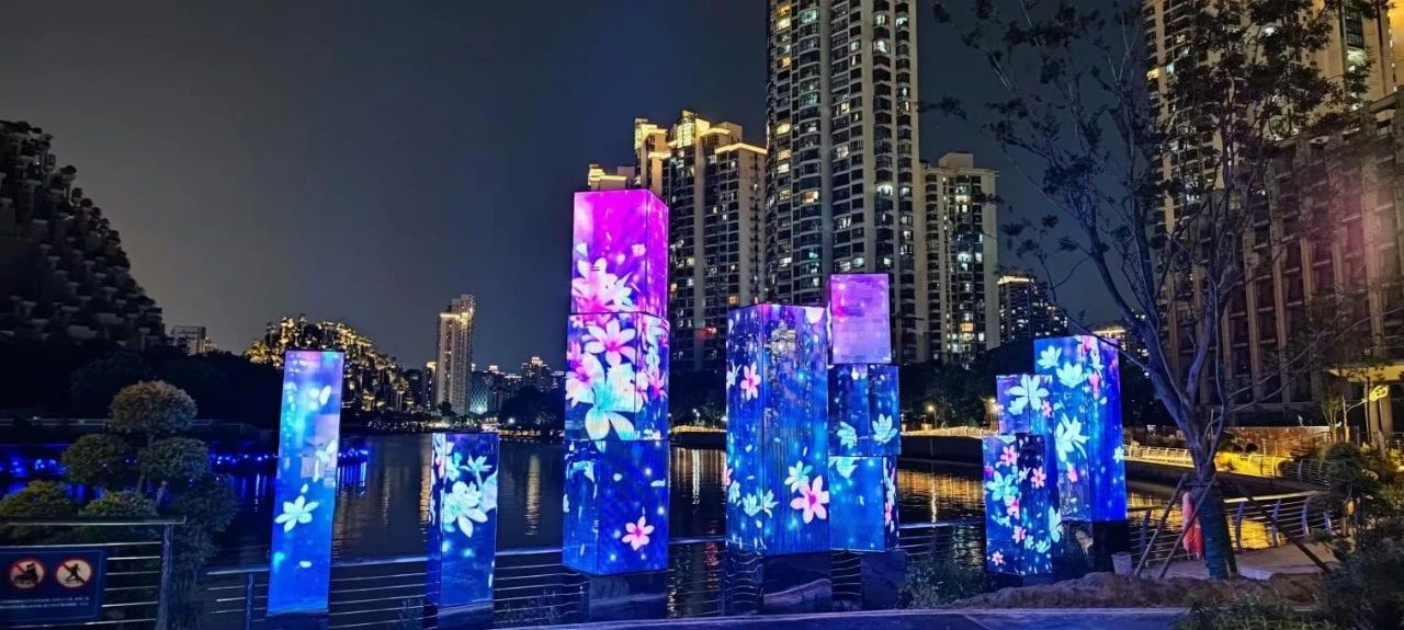 在花园湾,《鸢飞鱼跃》7块新型LED屏幕组成的造型犹如扇叶打开般优雅,冬去春来,点点涟漪,寓意自然生态与四季变幻的美好。