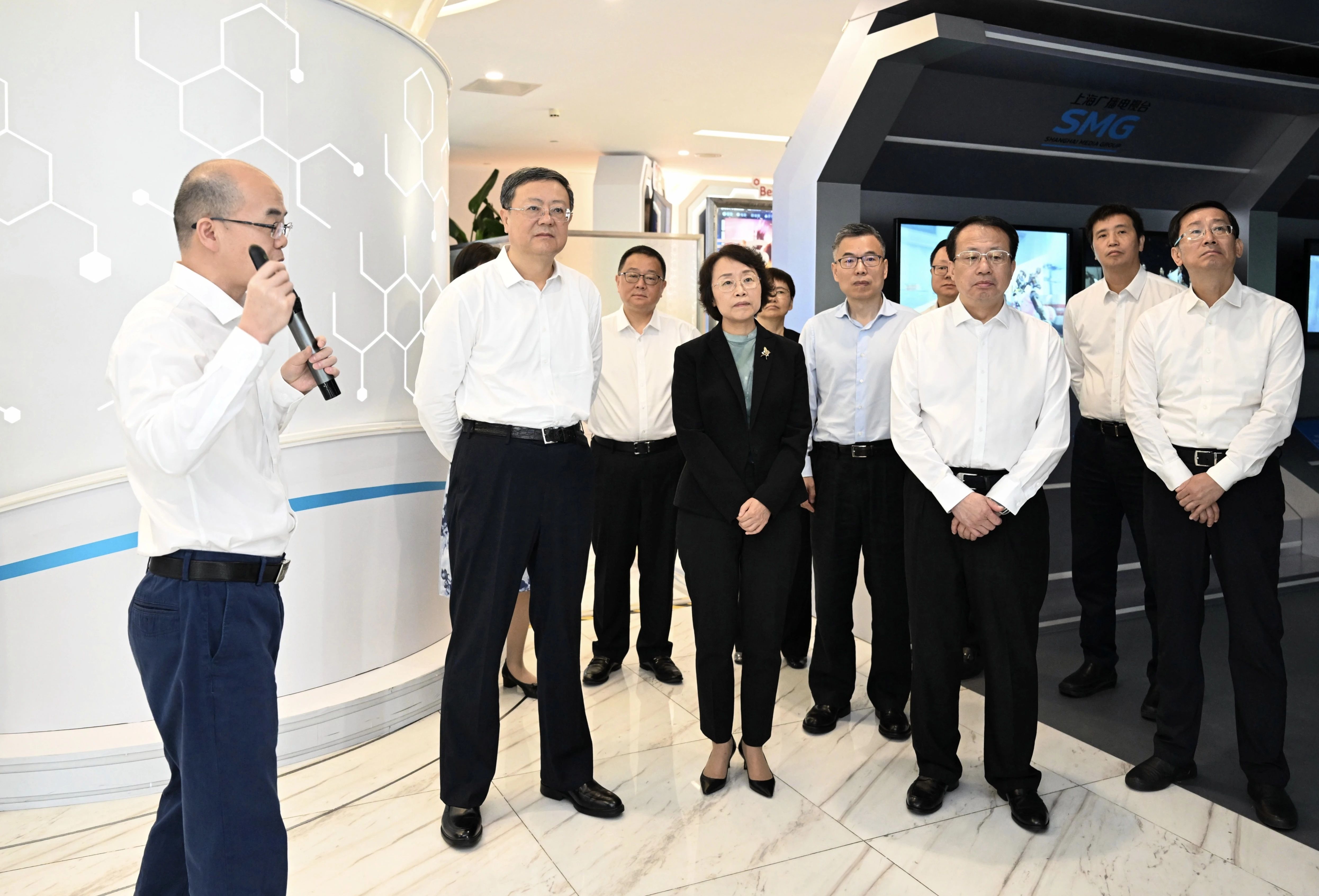 签约活动前,陈吉宁、曹淑敏、龚正等在上海广播电视台察看了上海超高清视频应用成果展示,了解上海超高清视频发展、内容创制、渠道终端、应用创新、产业生态等方面的探索实践和全产业链高质量发展的阶段成果。