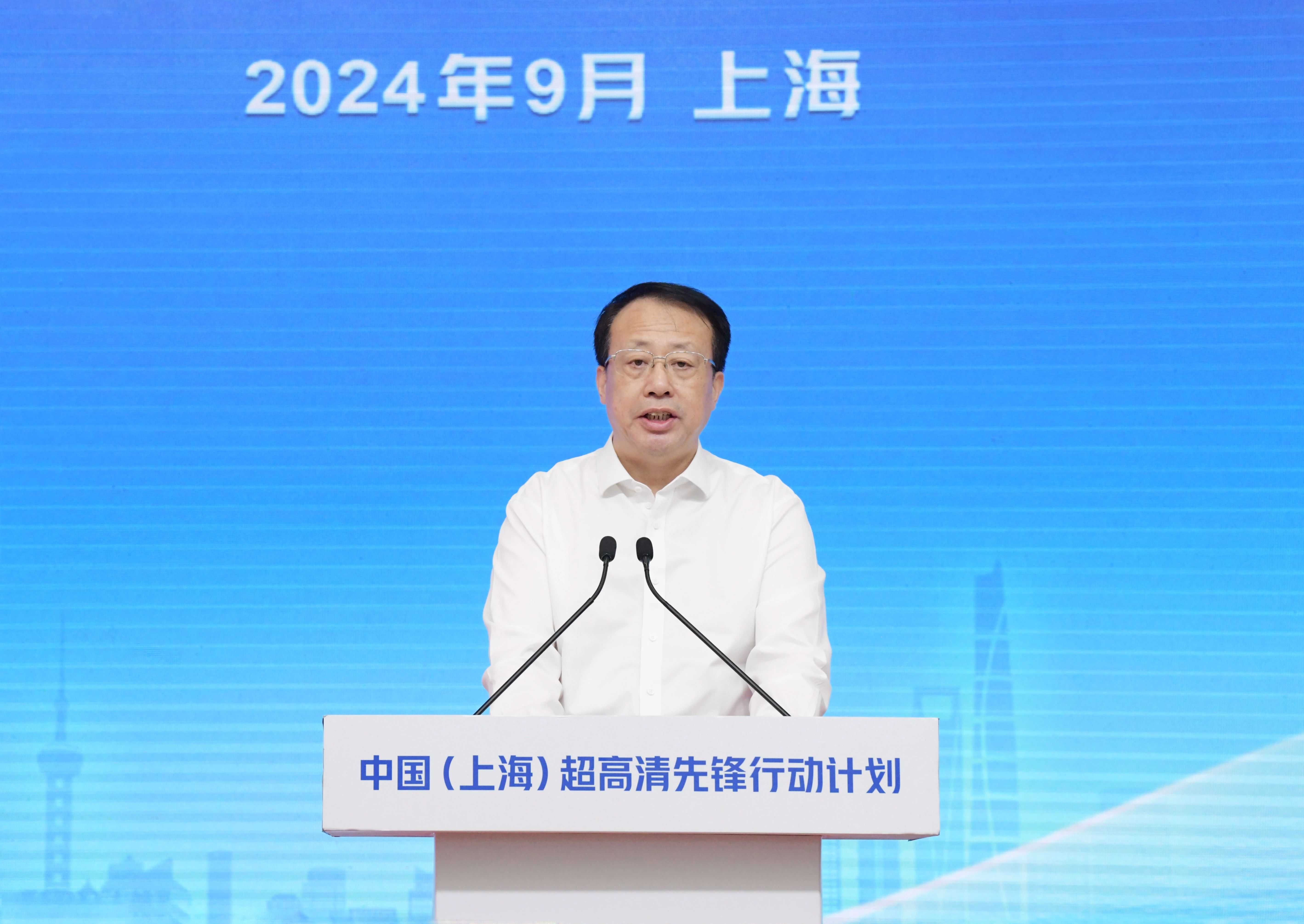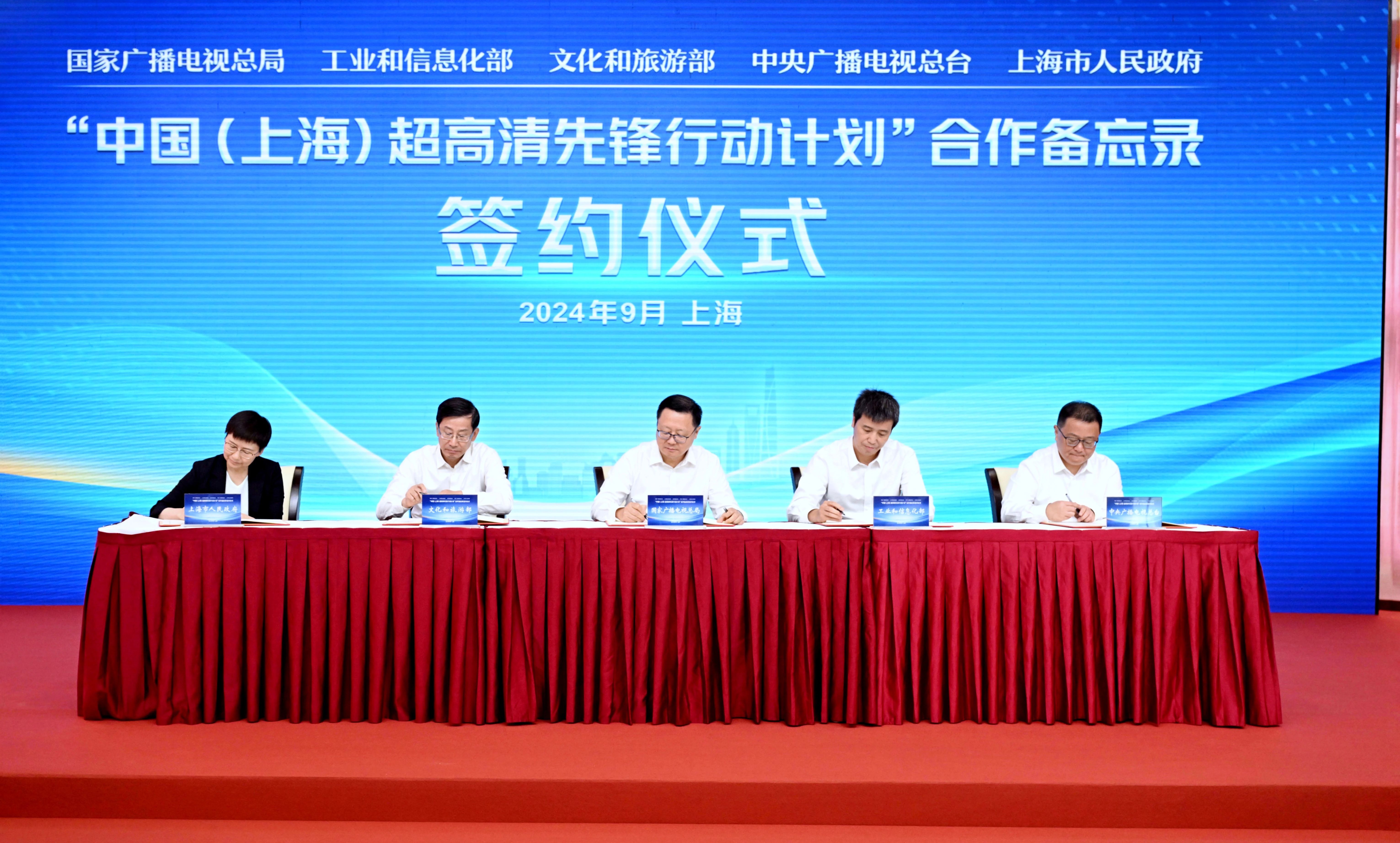 9月28日上午,国家广播电视总局、工业和信息化部、文化和旅游部、中央广播电视总台、上海市人民政府在沪签署“中国(上海)超高清先锋行动计划”合作备忘录。上海市委书记陈吉宁出席签约活动,中宣部副部长、国家广播电视总局局长曹淑敏,上海市委副书记、市长龚正致辞。