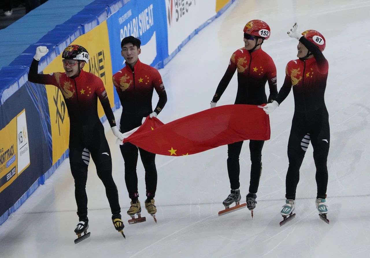 (刘冠逸、钟宇晨与队友在2023世锦赛男子5000米接力中夺得冠军)