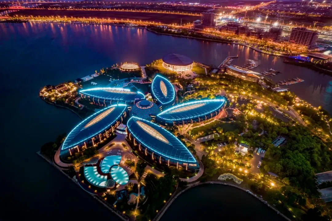 秀演联动湖面激光秀、沿湖景观带、楼宇灯光秀、裸眼3D视觉秀,将湖心的“水滴”雕塑化作光影的指针,随着夜幕的降临,自荣耀之环开始,光影指针顺时针旋转,逐一点亮整个滴水湖,秀演正式启动。