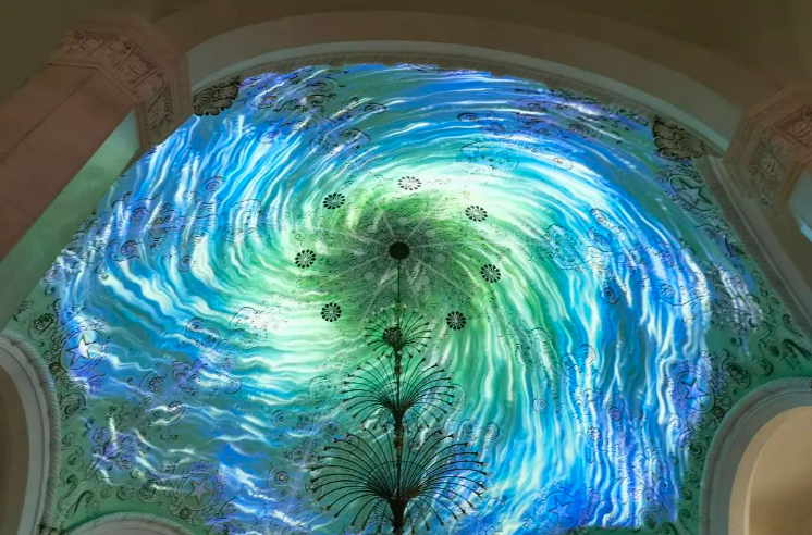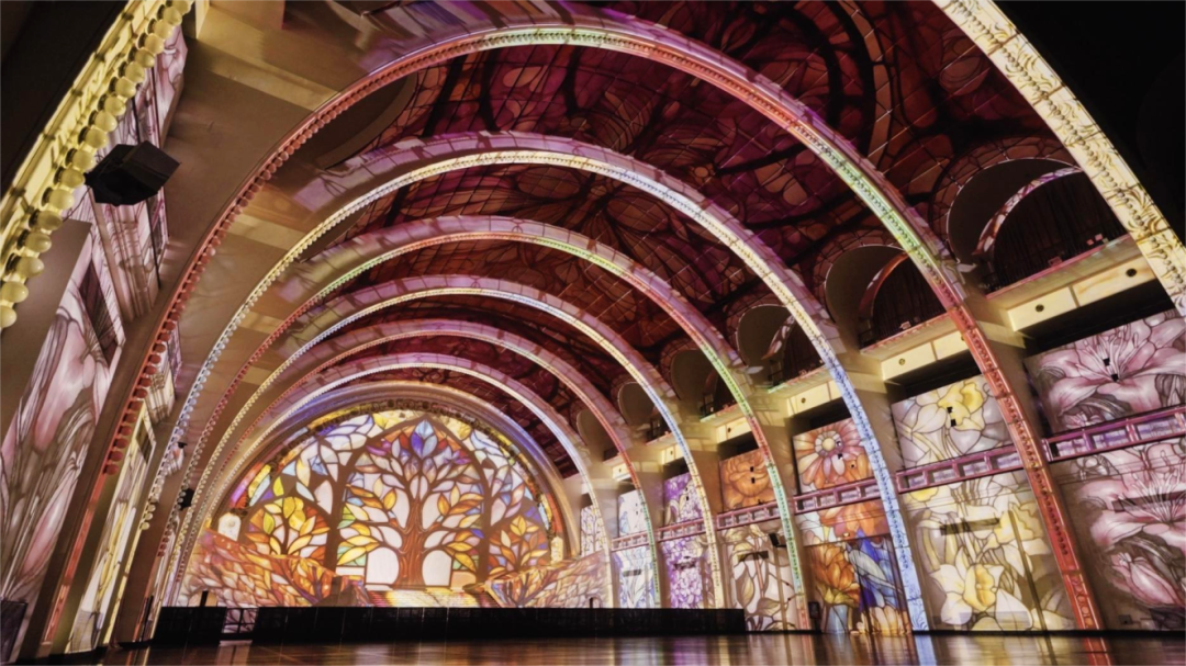 上海展览中心序馆的光影秀以“万光之境”为主题,以序馆的穹顶为投影面,通过穹顶光影氛围晕染,使观众进入一个梦幻般的光影世界。变幻莫测的灯光与投影效果在穹顶上呈现出绚烂夺目的光线与色彩,如同流动的光之波浪,将整个空间染上柔和而炫目的光晕,让观众仿佛置身于光的海洋。