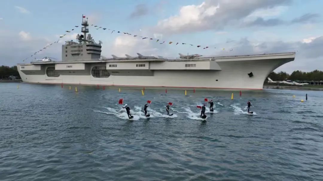 升旗仪式结束后,国防园中、航空母舰前,水上飞人与冲浪板表演拉开了帷幕,表演者在天空和水面上展现的高超技巧为游客带来了震撼的视觉盛宴,现场欢呼声、掌声不绝于耳。