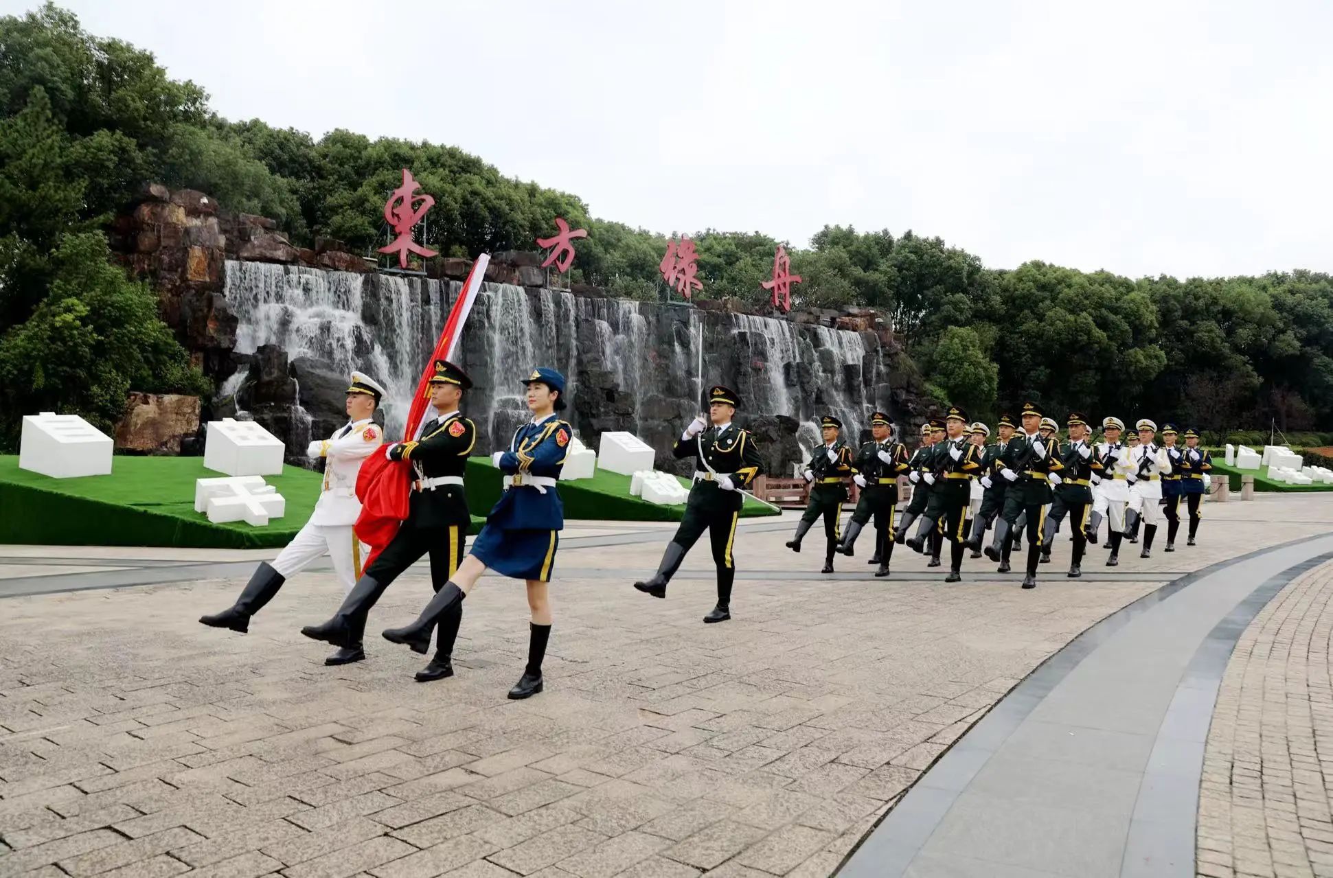 10月1日9时,在东方绿舟的地球广场,由来自中国人民解放军三军仪仗队等全军优秀部队退役教官组成的东方绿舟国旗护卫队为游客带来了一场庄严、肃穆的升旗仪式,共祝国庆75周年。