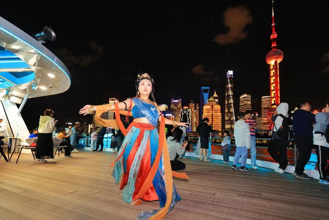东方明珠塔还特别推出“上海之星·何以敦煌”主题航班,通过与敦煌艺术大展跨界合作,水岸联动,打造浦江文旅新名片。“上海之星”船舱内部的星空顶屏、高清数字大屏以敦煌壁画元素为主题,配以AIGC微电影解说,让观众身临其境实现“在上海看敦煌”。