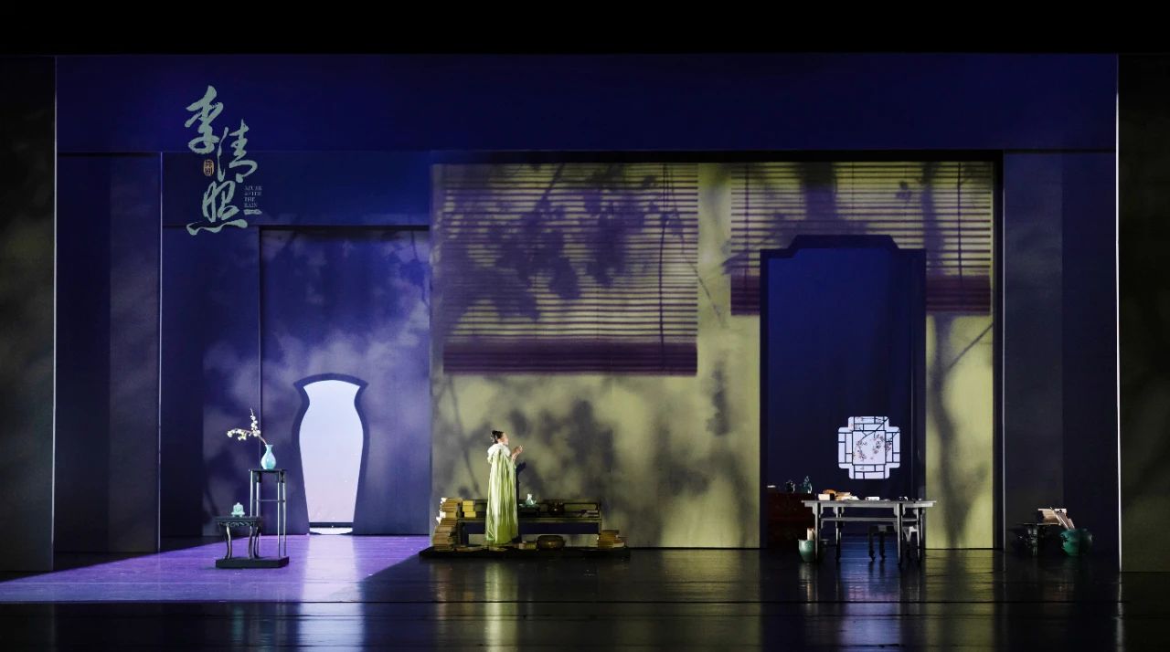 舞剧《李清照》舞台设计深刻汲取宋代美学精髓,并巧妙融合江南文化诗性美感和民俗风情——无论是素净淡雅的汝瓷天青色主题元素,亦或追求简洁、纯净,强调圆融、对称、素雅和质感的场景,追求集中体现宋代美学典雅的“诗意哲学”。