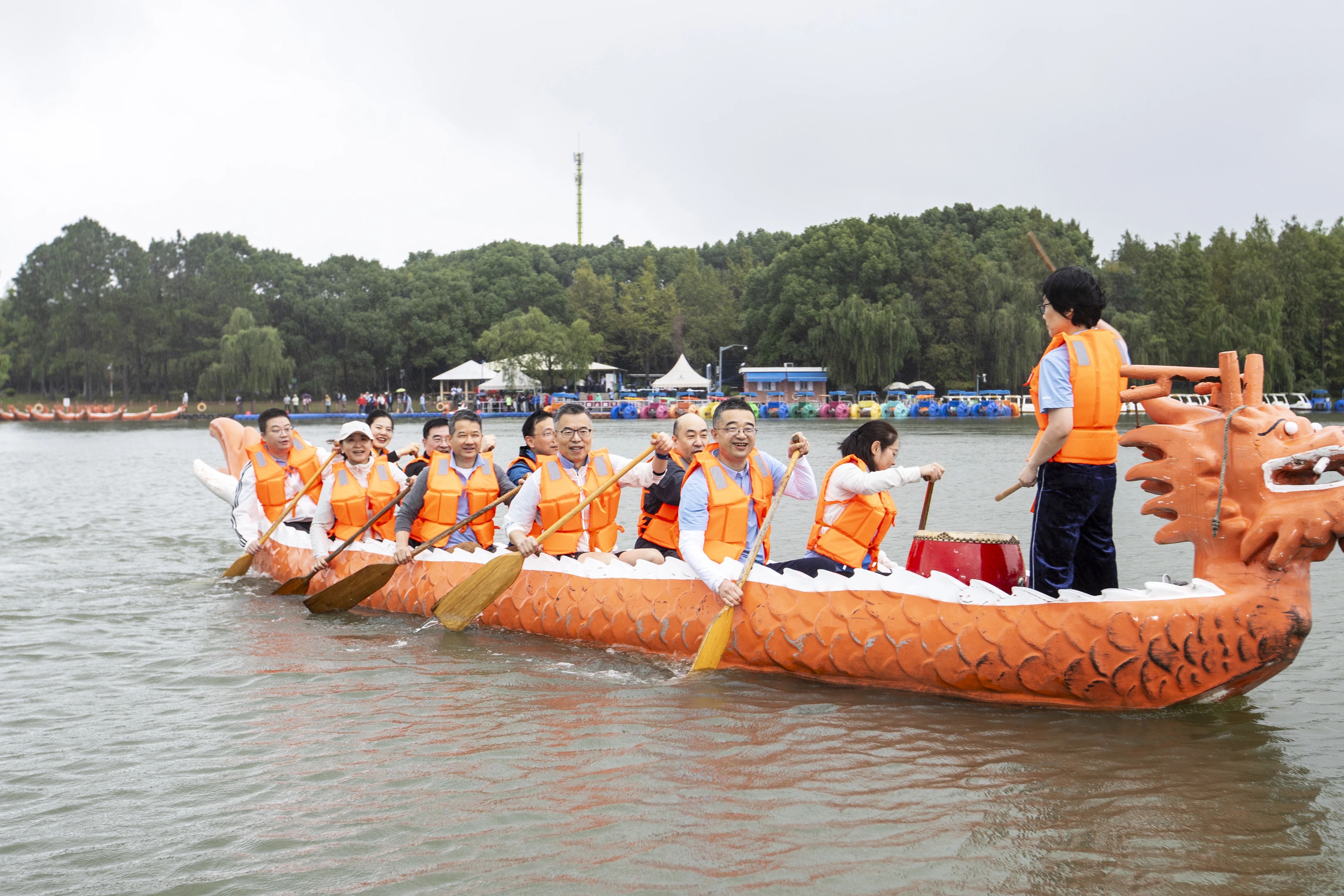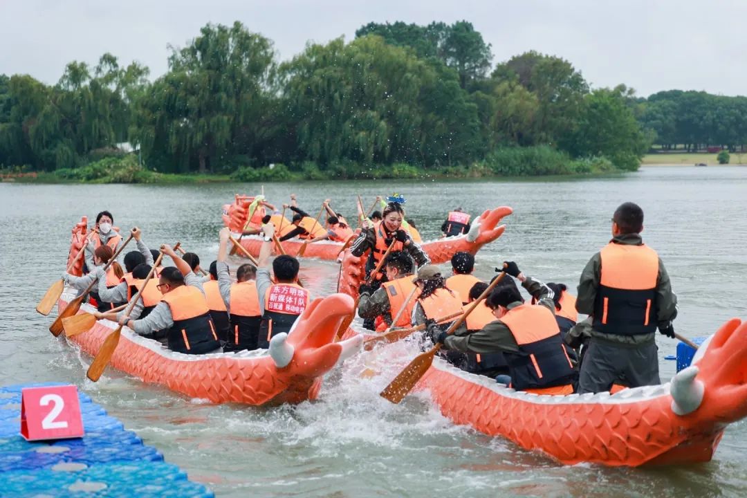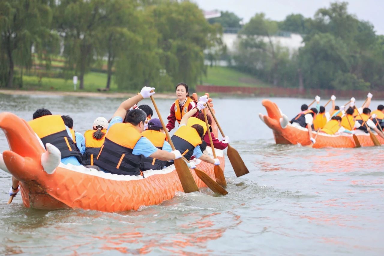 与此同时,龙舟码头边上,“同舟共济”趣味龙舟比赛正在如火如荼地进行着。只见龙舟在水面上飞驰,运动员们齐心协力,划桨如飞,水花四溅,场面蔚为壮观。