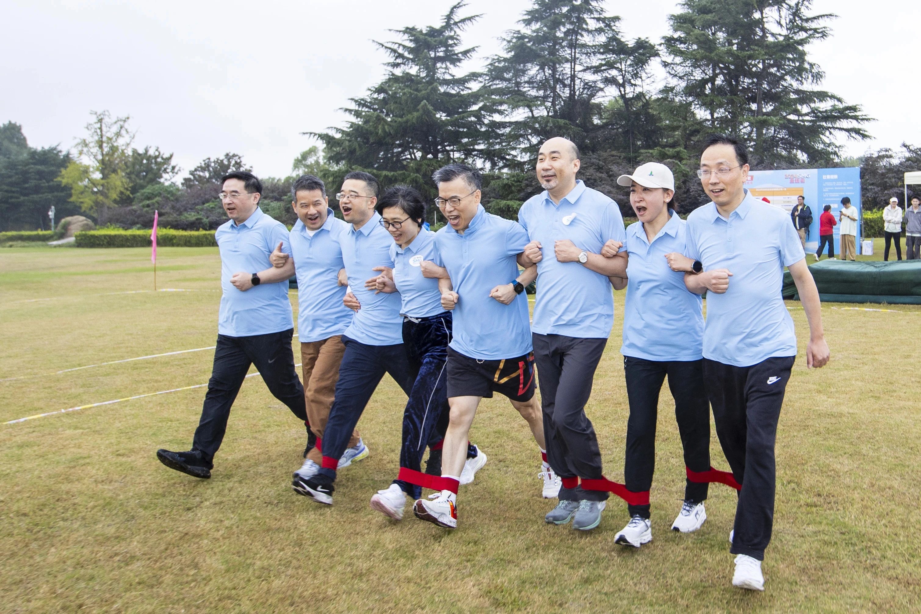 徒步活动结束后,“步调一致”绑腿跑鸣枪开赛。只见参赛队员们八人一组,将腿绑在一起,齐心协力向前奔跑。他们齐步向前,配合默契,充分展现了团队协作的力量。