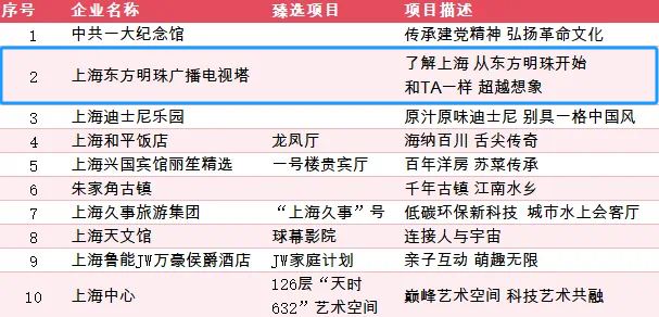 由上海市文化和旅游局指导,上海市旅游行业协会主办的“迎第七届进博会旅游行业动员大会暨上海旅游行业‘白玉兰臻选’创新案例发布会”10月29日在上海举行,10家“白玉兰臻选”企业名单正式发布。其中,上海东方明珠广播电视塔榜上有名。