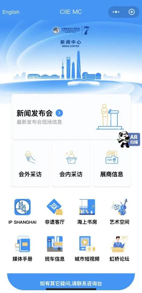 在小程序功能上,将AR扫描功能内置入小程序,与现场的媒体记者进行互动,记者可以使用该功能扫描位于新闻中心二楼环廊的《嗨!嗨!上海!》(Hi!Hi!Shanghai!)艺术插画展、上影元《大圣的假期》、海上书房的“上海字体海报墙”,观看实时动画效果,在新闻中心发现更多有趣体验。