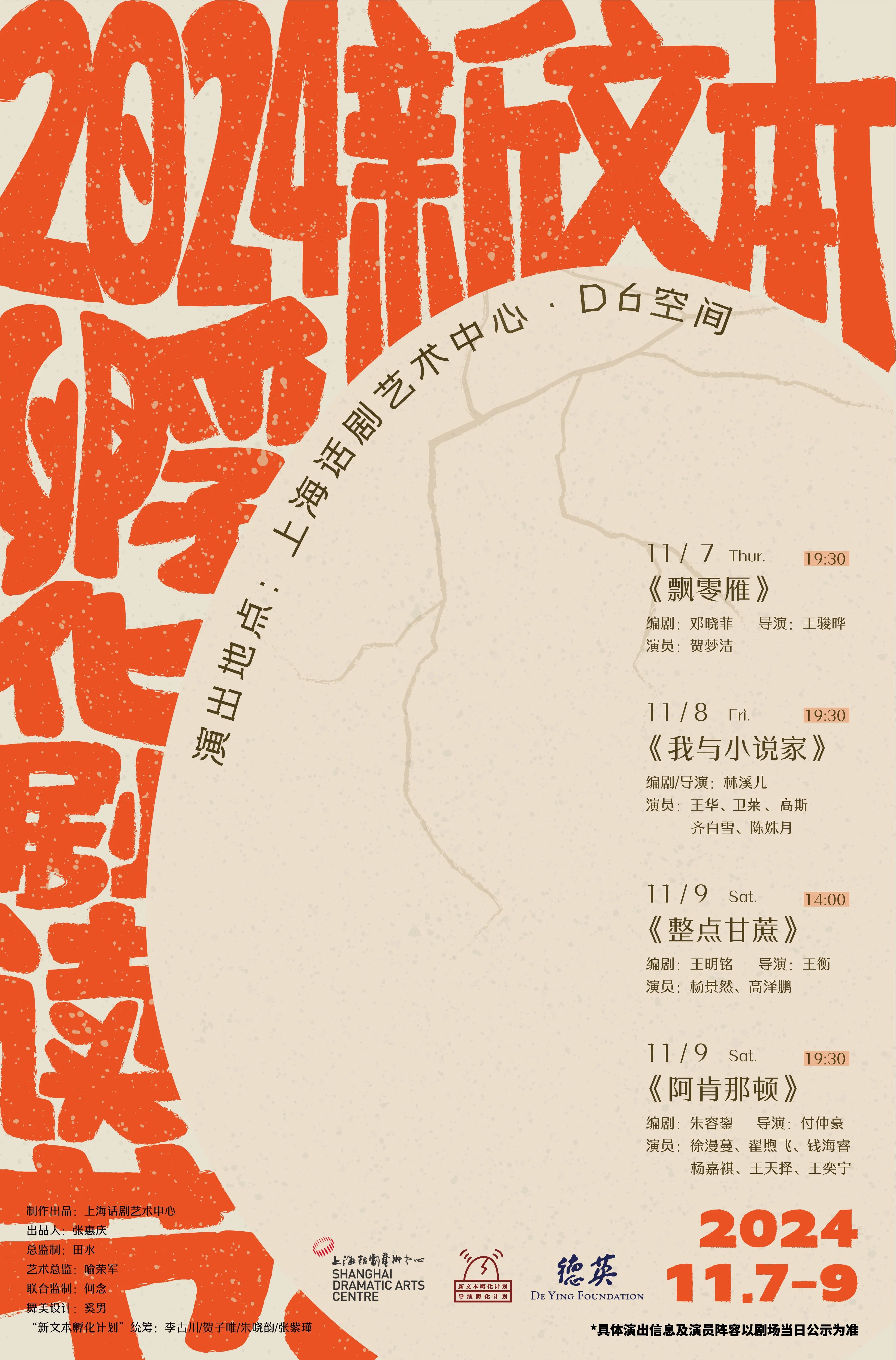 本次剧读节作为上海话剧艺术中心原创剧本孵化平台——“新文本孵化计划”的升级活动,对入围孵化的四部原创剧本《飘零雁》《我与小说家》《整点甘蔗》《阿肯那顿》进行了集中展示。