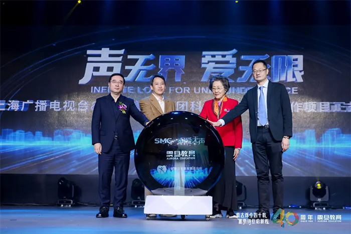 震旦教育集团成立40周年大会上,宝山区副区长丁力,上海广播电视台(上海文广集团)副台长、副总裁陈思劼,震旦教育发展基金会理事长张惠莉,上海广播电视台“润爱无声”项目负责人张炜共同按下项目启动按钮。