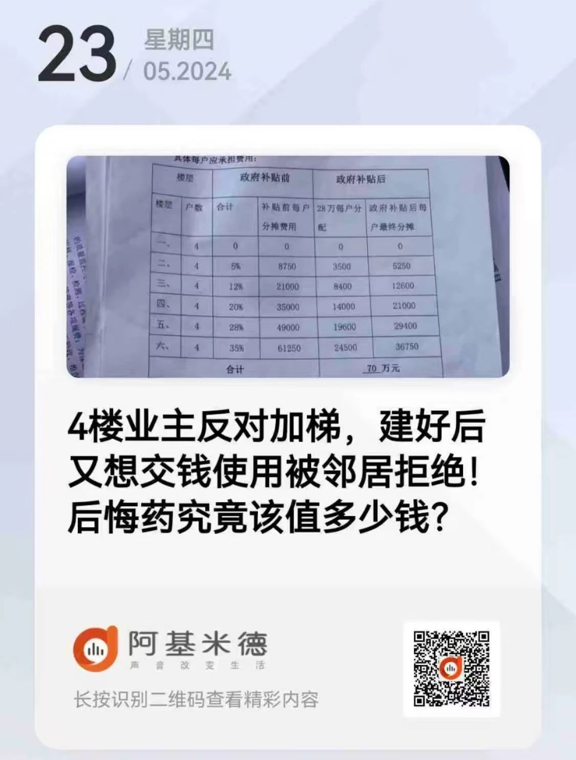 这篇报道从一起因加梯引发的邻里纠纷,关注到“后加梯时代”的难题——曾经反对加装电梯的业主,又想使用电梯该怎么办?当时因为一家反对,一度让整幢楼加梯陷入僵局,眼下有“后悔药”可以吃吗?补交的费用该如何计算?
