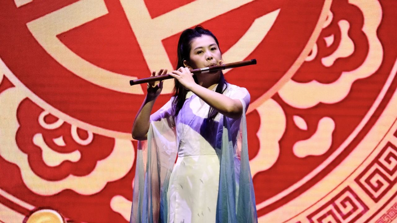 上海滑稽剧团竹笛演奏员孙梦吹响笛子独奏《跑旱船》,欢腾热烈的旋律,为观众呈现了一幅活灵活现的生活场景。