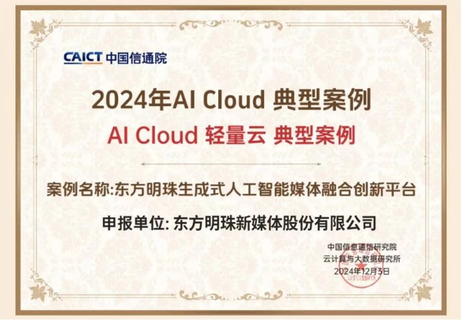 在近日举行的2024全球数字经济大会云·AI·计算国际合作论坛上,2024年“AI Cloud助力大模型场景化和工程化落地”典型案例评选结果正式发布。东方明珠新媒体股份有限公司的生成式人工智能媒体融合创新平台荣获2024年度“AI Cloud轻量云典型案例”。该论坛由全球数字经济大会组委会主办,工业和信息化部下属中国信息通信研究院、中国通信企业协会承办。
