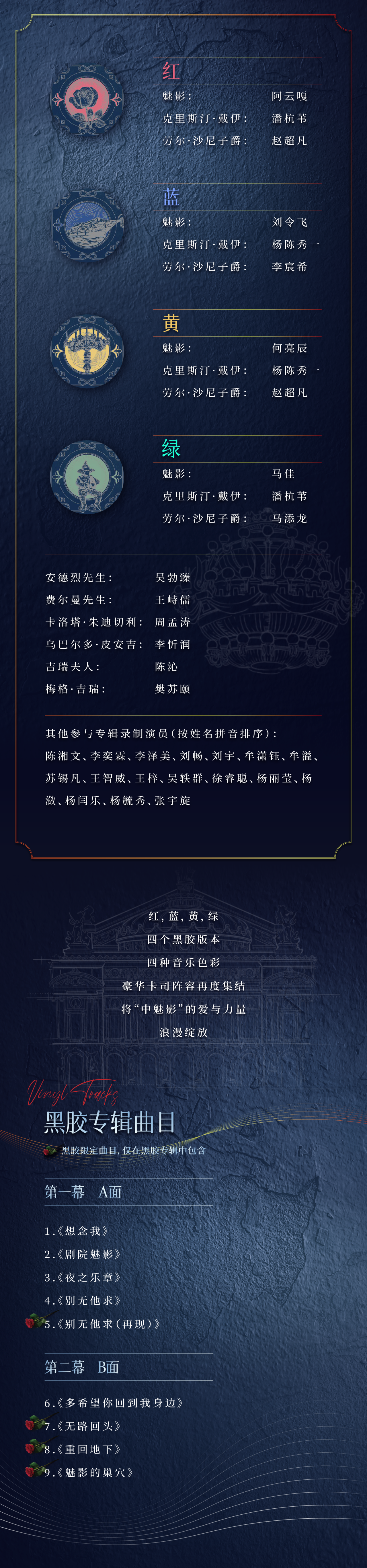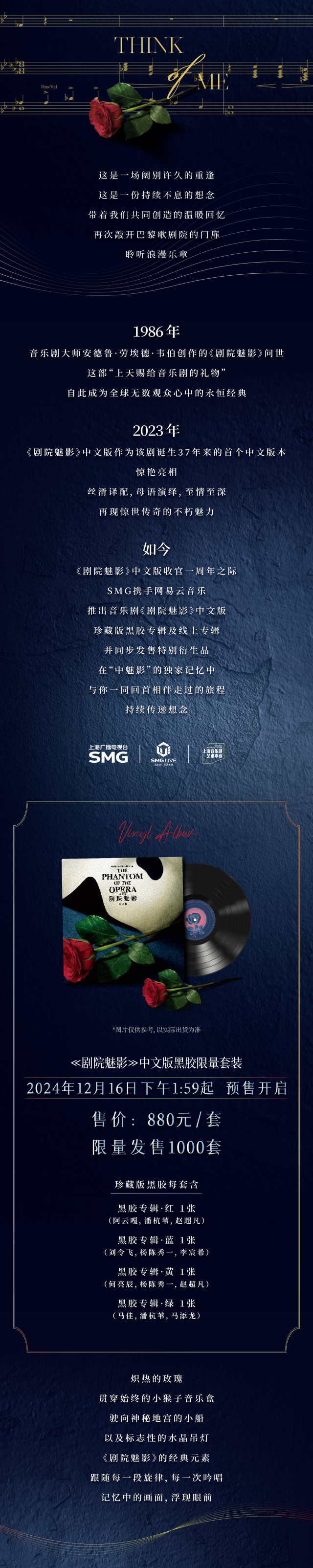 此次发行的《剧院魅影》中文版黑胶套装限量1000套,每套包含红、蓝、黄、绿四个版本各一张,囊括多首黑胶限定曲目,并随每张专辑附赠黑胶歌词内页,可至“网易云音乐”购买。