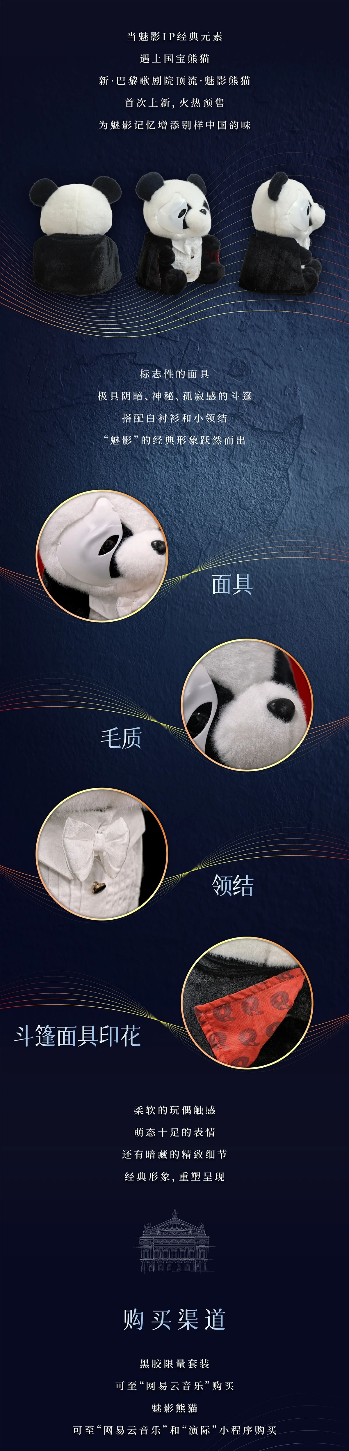 随着音乐作品发布,《剧院魅影》中文版熊猫玩偶也已同步开启预售——魅影经典IP元素与国宝熊猫相结合,为魅影记忆增添别样中国韵味,可至“网易云音乐”和“演际”小程序购买。