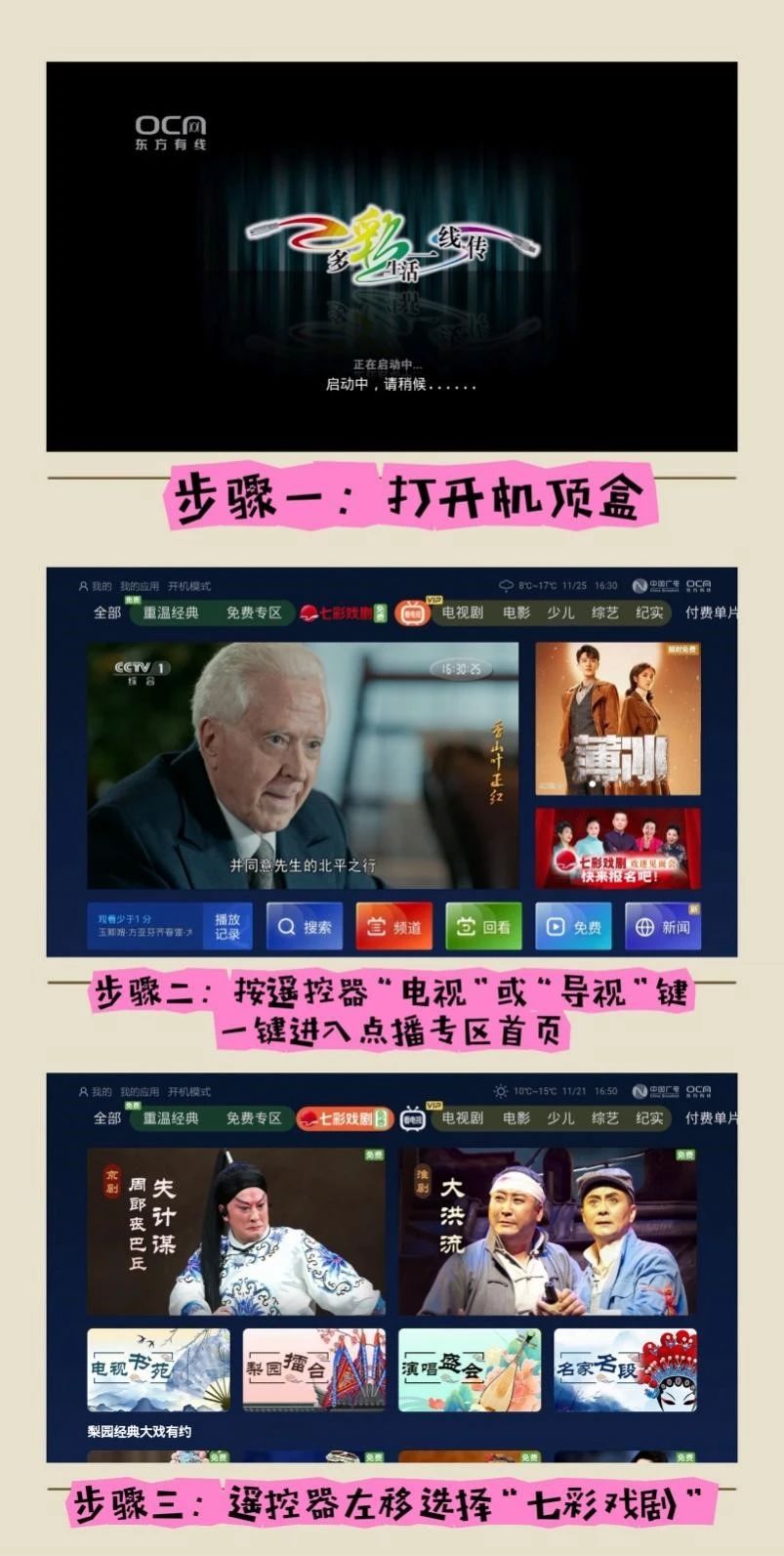 只要您开通了东方有线点播功能,打开机顶盒,进入点播专区首页“看电视”,遥控器左移选择“七彩戏剧”,即可免费收看。