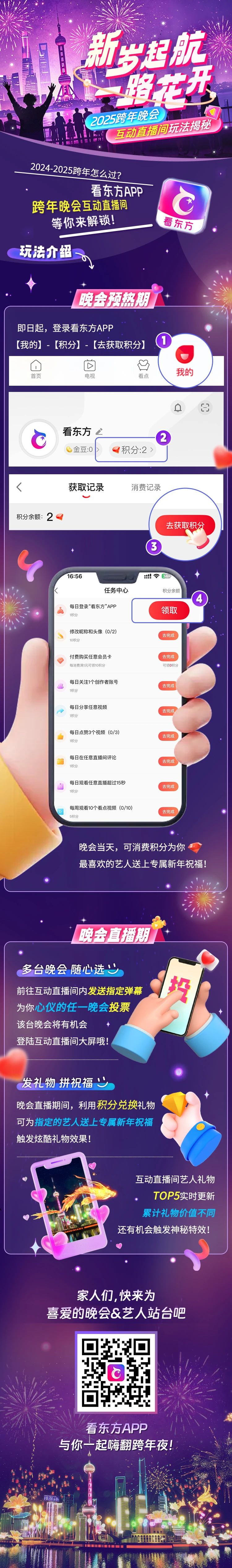 看东方APP 2025互动跨年季现已开启预热模式。立即登陆看东方APP-【我的】-【积分】-【去获取积分】完成小任务即可获取积分。预热期获取的积分越多,12月31日晚可使用与兑换的助力与加热方式也会更多哦~赶快行动起来吧!