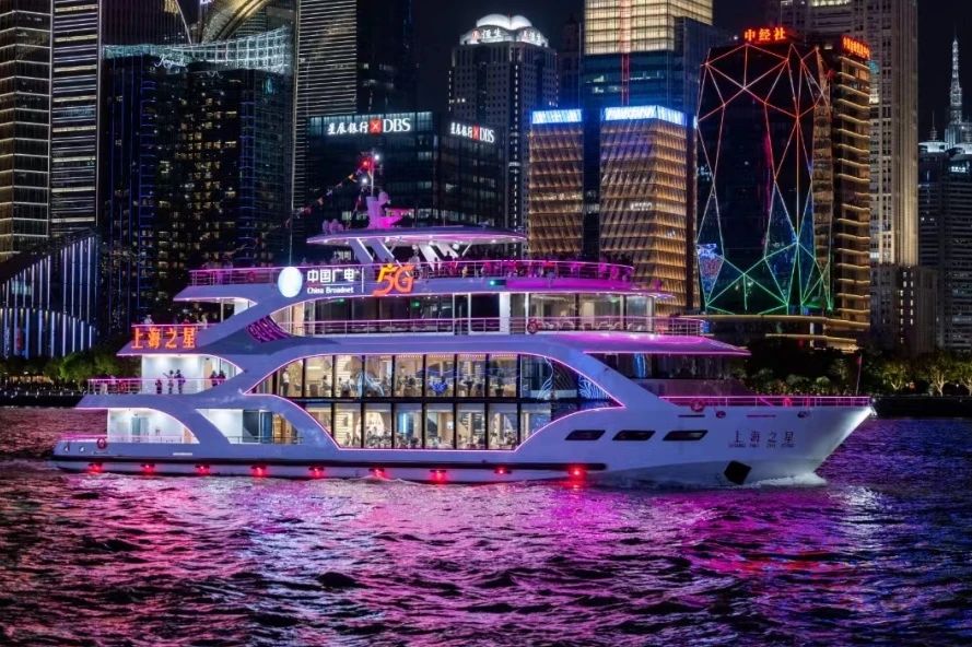 提升后的东方明珠旅游码头,运用全新的配色理念及智能控制系统进行光彩艺术晕染,五星级游船“中国广电5G·上海之星”号突破性在顶层甲板、全船护栏区引入沉浸式灯光展示,为游客带来升级的浦江夜游体验。
